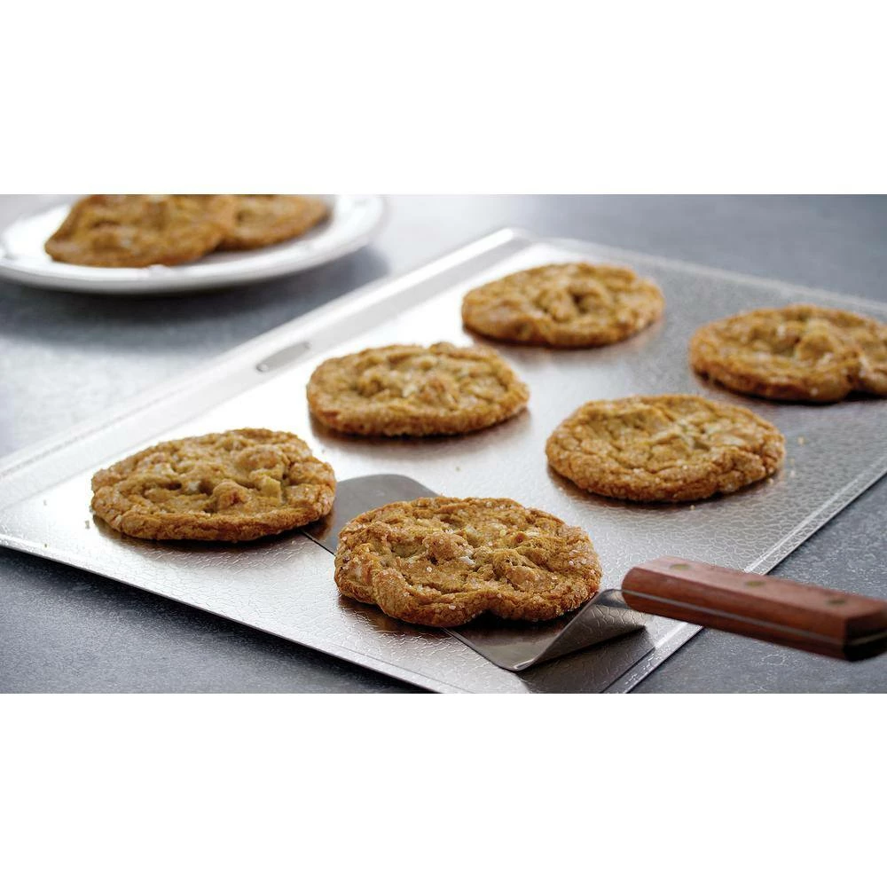 - Premium quality 18-Gauge aluminum baking pan, the choice of professional bakers; heat safe to 428 degrees F, 220 C; 10 in. x 14 in. x 0.5 in. cookie sheet
