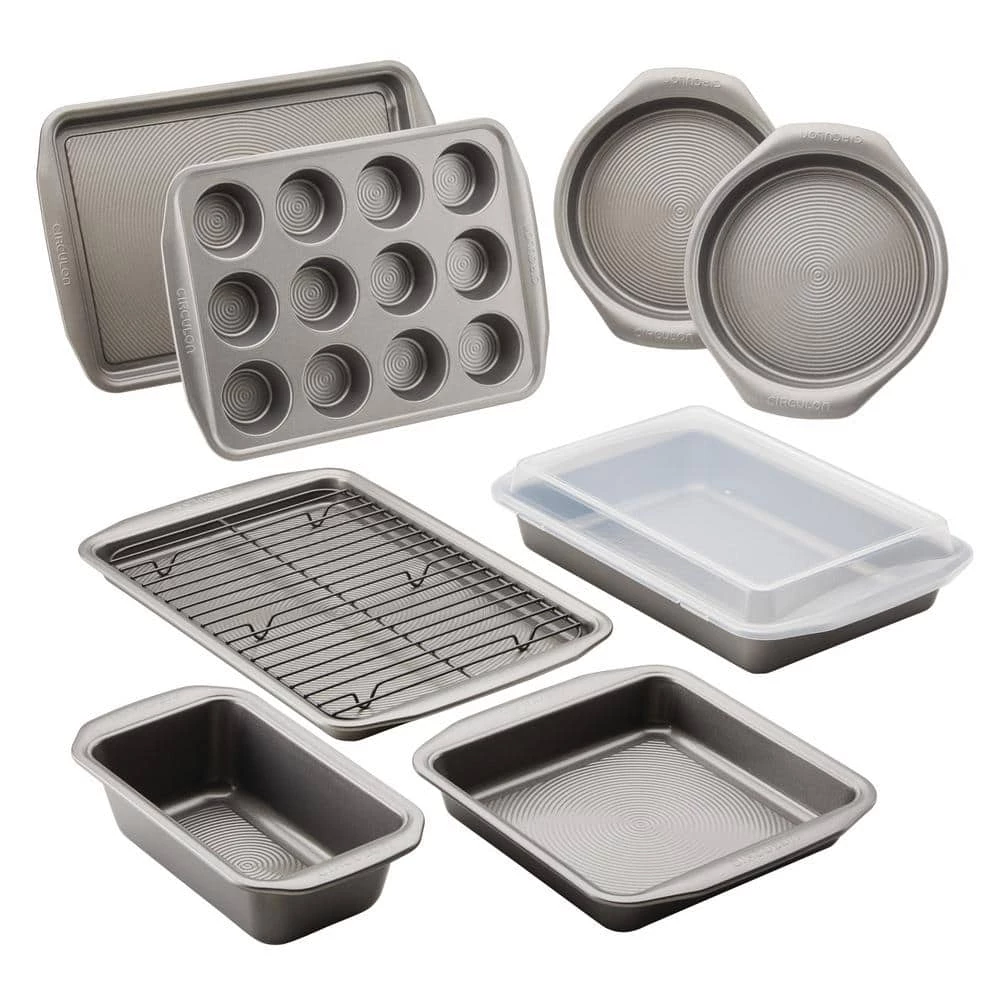 - SET INCLUDES: Two 9-in. Round Cake Pans, 9-in. Square Cake Pan, 9-in. x 5-in. Loaf Pan, 9-in. x 13-in. Covered Rectangular Cake Pan, Two 10-in. x 15-in. Cookie Pans, 12-Cup Muffin/Cupcake Pan, 9.25-in. x 14-in. Cooling Rack
