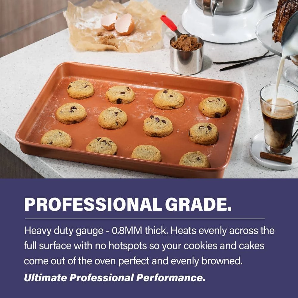 - GOTHAM STEEL COOKIE SHEET – bakery quality commercial grade bakeware is constructed from a solid sheet of aluminum which conducts heat evenly with no dead zones or hotspots and then triple coated with nonstick ceramic for the ultimate experience – and non-warping + dishwasher safe for effortless cleanup.