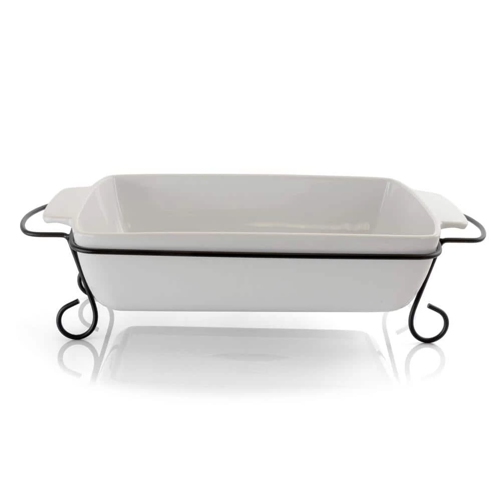 The GIBSON elite 2-piece 15.5 in. stoneware bakeware with metal rack really puts the feast together. This 2-piece serving set features a rectangle bakeware container made -of stoneware. Its oven safe so you can cooking and directly bring it from the oven to the dinning table. Display your wonderful meal with the matte black metal rack that keeps the heat away from the table’s surface. Serve just about anything you can think of, from peach cobblers and apple strudels to baked tilapia and stuffed chicken breasts. Perfect for any large gatherings, use it to display a side dish or show off the main course.