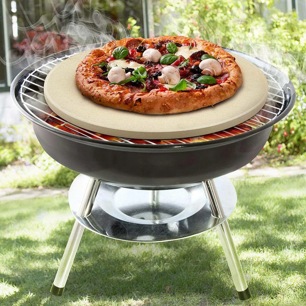 The Cook N Home true Cordierite pizza grilling baking stone 16 in. Round x 5/8 in. Thick is produced from true Cordierite which has passed us FDA and German food Code LFGB and RoHS compliances. It is heat safe up to 2000°F with no odor and excellent thermal shock resistance. Best for baking fresh or frozen pizzas in your home grill or oven, giving you the same crispy crust as pizza baked in brick lined commercial ovens. Cordierite stones retain heat and transfer heat evenly while extracting and absorbing moisture from the baking food thus creating the best crispy crust. Hand wash in clean water after baking stone cools. Use Wood or plastic Scraper to remove excess food. Not dishwasher safe. Never use soap and detergent. Include one multi-function plastic Scraper.
