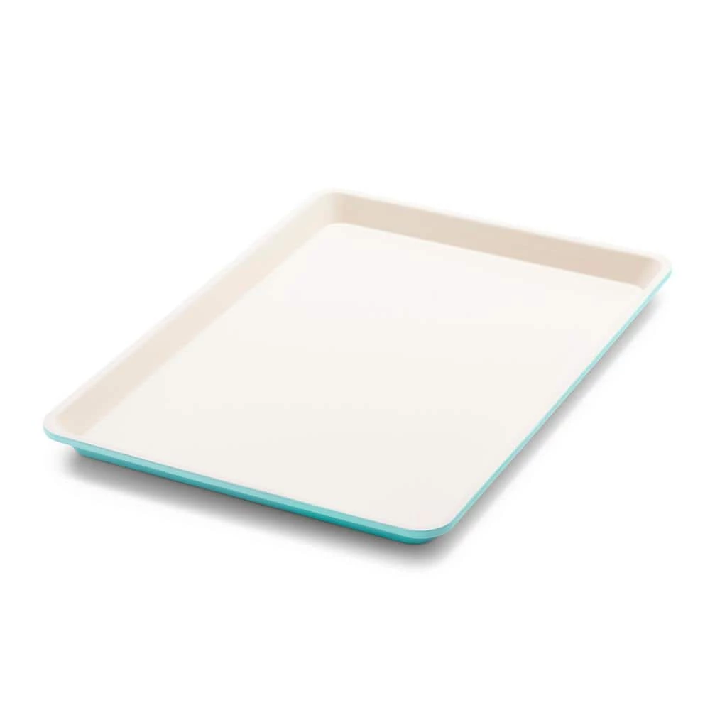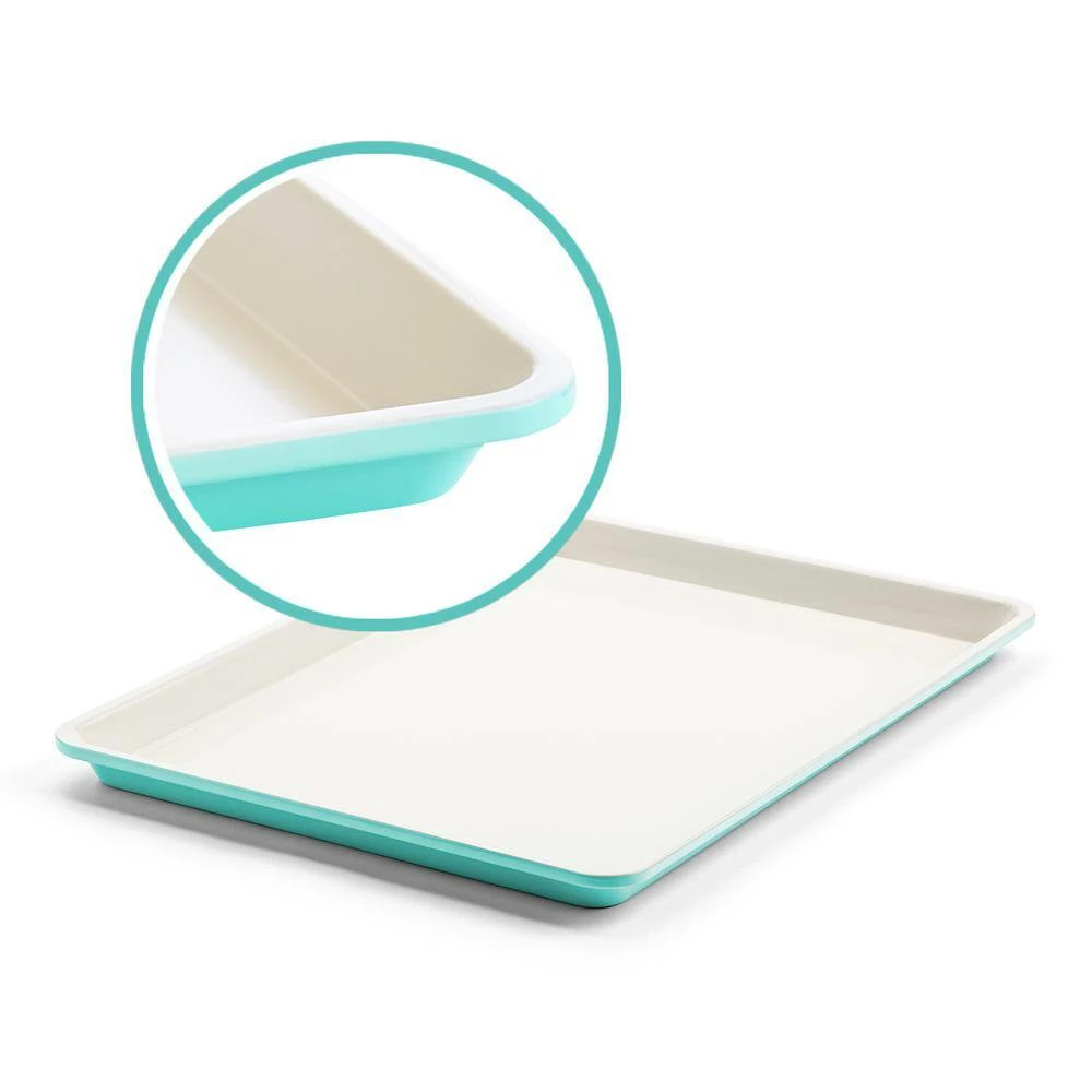 Who ordered cookies. This versatile cookie sheet isn’t a one-treat wonder, though. Crafted from heavy-duty steel and finished with reinforced rims for extra strength and durability, this pan delivers fast and even heating for sweet and savory dishes alike. Featuring an easy-to-clean ceramic nonstick coating, this pan is effortless to clean and free of PFAS, PFOA, lead and cadmium. Oven safe up to 450°F. Hand wash only.