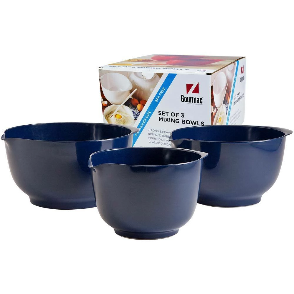 These are the original, now iconic, melamine Margrethe Mixing Bowls. The heavy wall construction will hold up to the most vigorous mixing. The non-skid rubber ring bottom keeps the bowl in place, just where you want it. A comfortable handle and pouring lip add to the many features that this classic bowl provides. Each is heat resistant to 360° and is dishwasher safe. BPA free. Not for use in the microwave. Set includes a 2, 3, and 4 l Bowl.