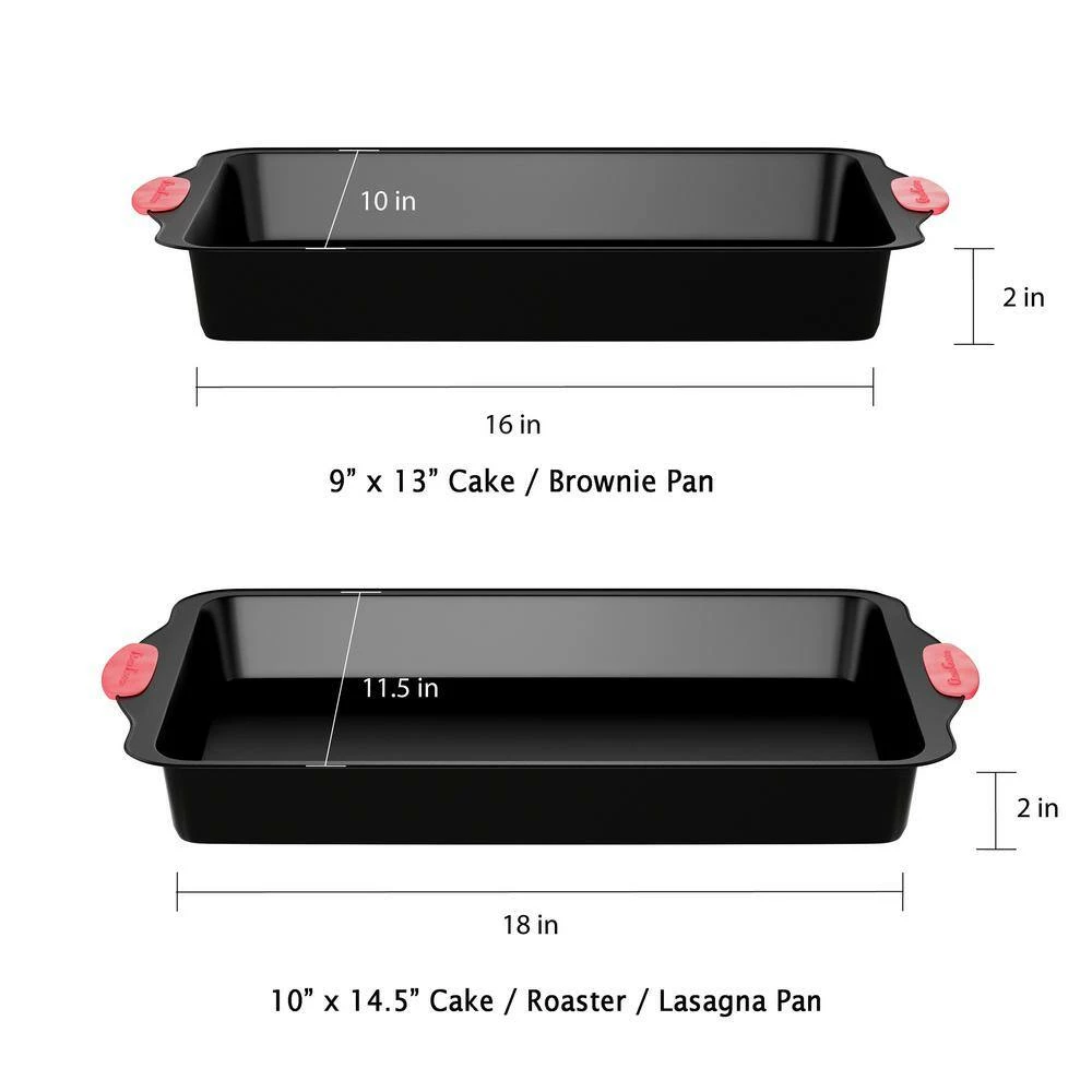 - VERSATILE 2-PC SET- With a 9″x 13″ pan for cakes, bars or brownies, and a large 10″x 14.5″ roaster pan for meats, lasagnas or veggies, this versatile cookware is perfect for every recipe.