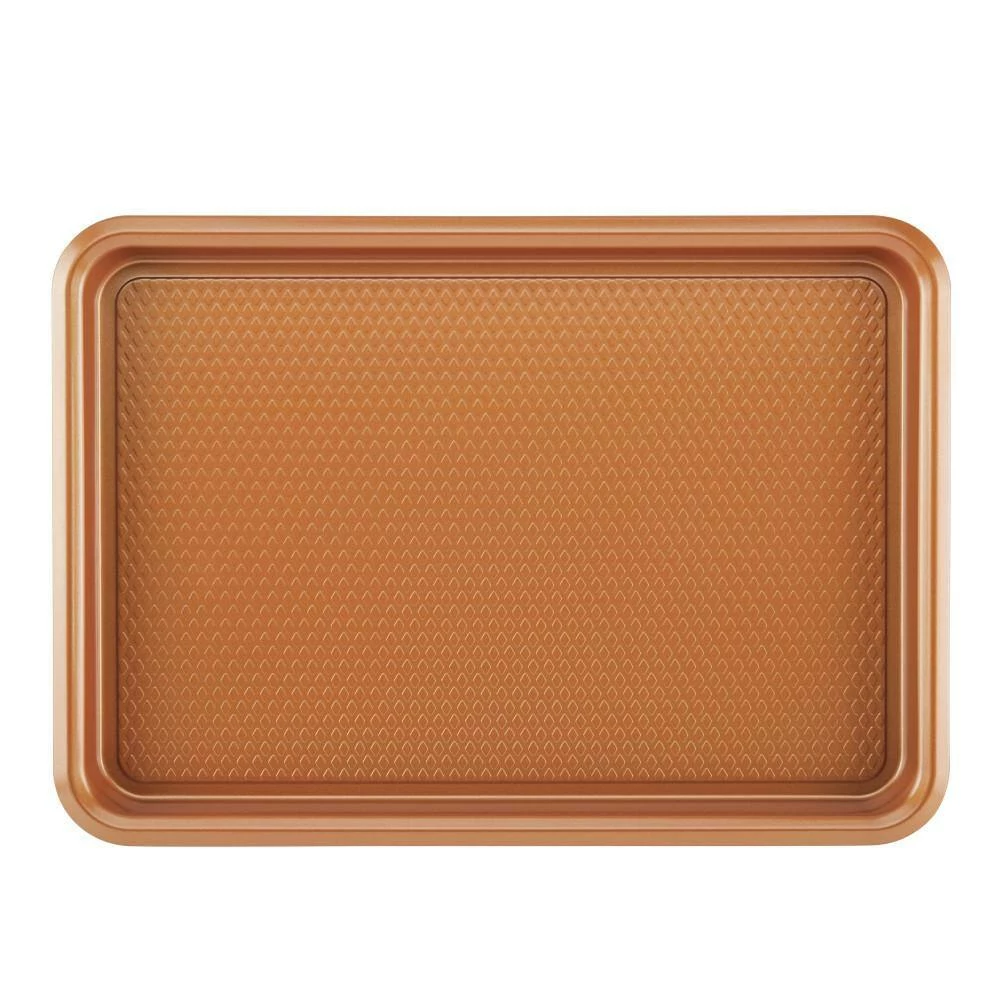 Move your soft and chewy chocolate chip cookies right from the oven and onto the cooling rack with the Ayesha Curry 2-Piece Cookie Pan Set, featuring a 10 in. by 15 in. cookie pan and matching cooling rack. Constructed from high-performance steel, the set has everything you need for out of the box baking and boasts excellent resistance to warping and bending for great results, recipe after recipe. A texturized diamond pattern assists with both enhanced browning and easy food release, so chicken tenders and buttery baked goods cook evenly and don’t stick to the pan. Extended edges provide a sure and sturdy grip for pulling a batch of crispy French fries off the center rack or for tossing broccolini in mid-roast. Plus, this Ayesha Curry kitchenware helps support No Kid Hungry to provide up to 500,000 meals to children in need. Oven safe to 450°F, the cookie pan is suitable for a wide range of sweet and savory recipes, and features an enhanced non-stick coating with textured diamond surface for healthy cooking and long-lasting food release. Both the pan and cooling rack are dishwasher safe, too, so weeknight meals and signature recipes provide Instagram-ready results with easy cleanup (hand wash recommended to prolong product life). Line up your ingredients and let the bake-off begin with the Ayesha Curry Cookie Pan and Cooling Rack Set.