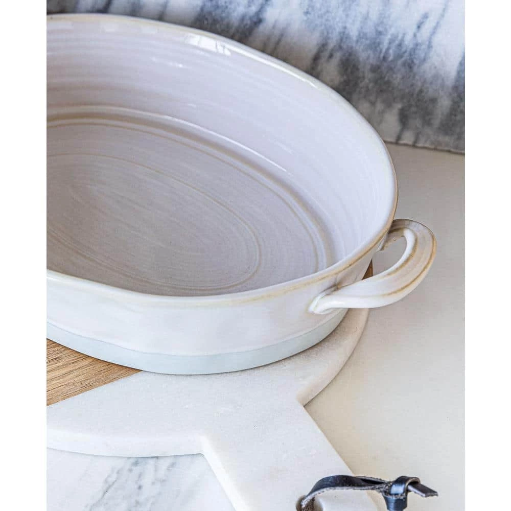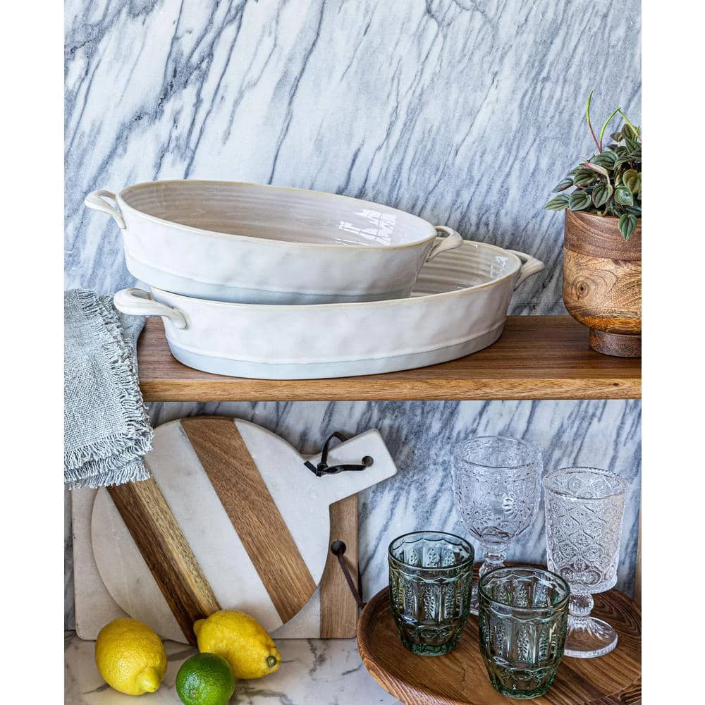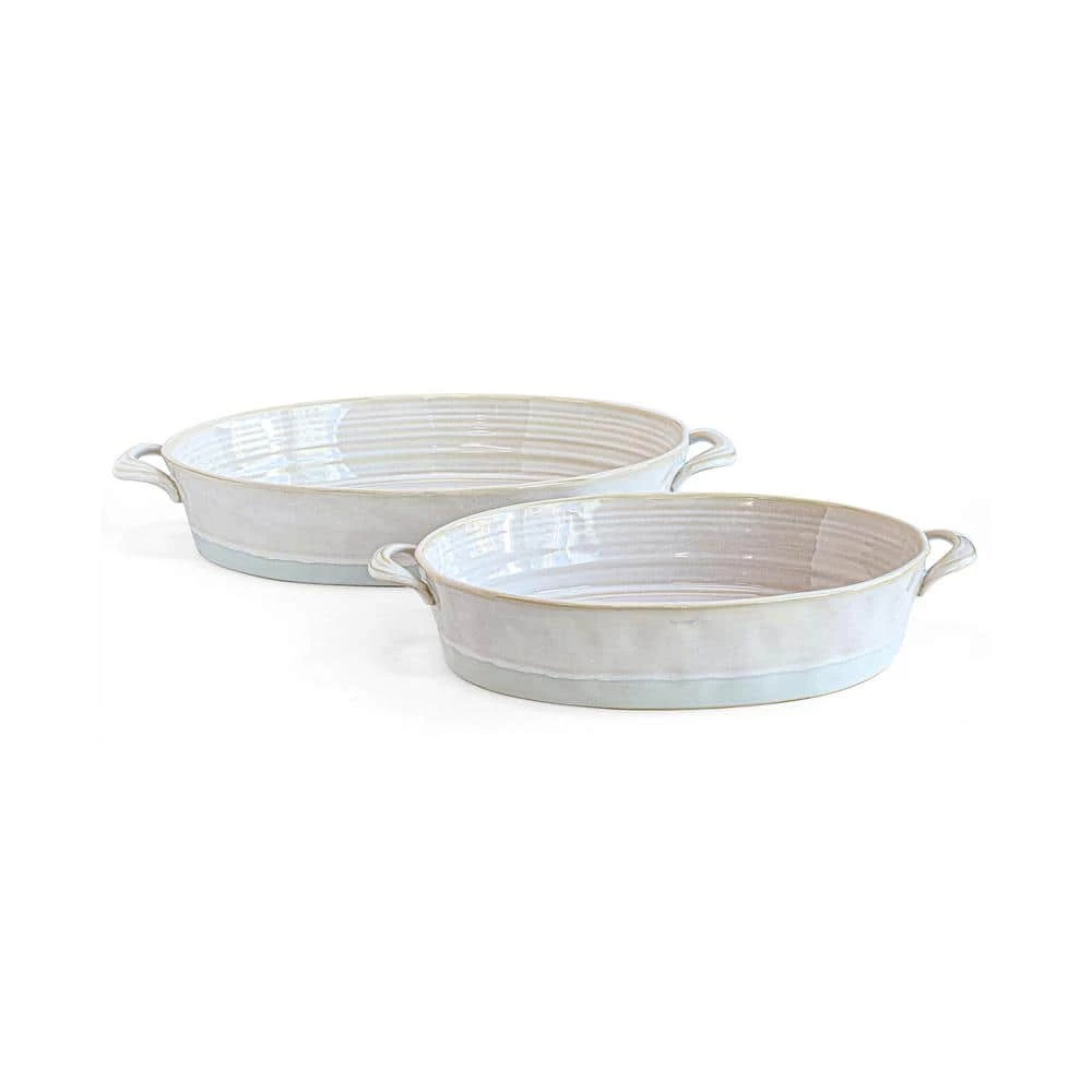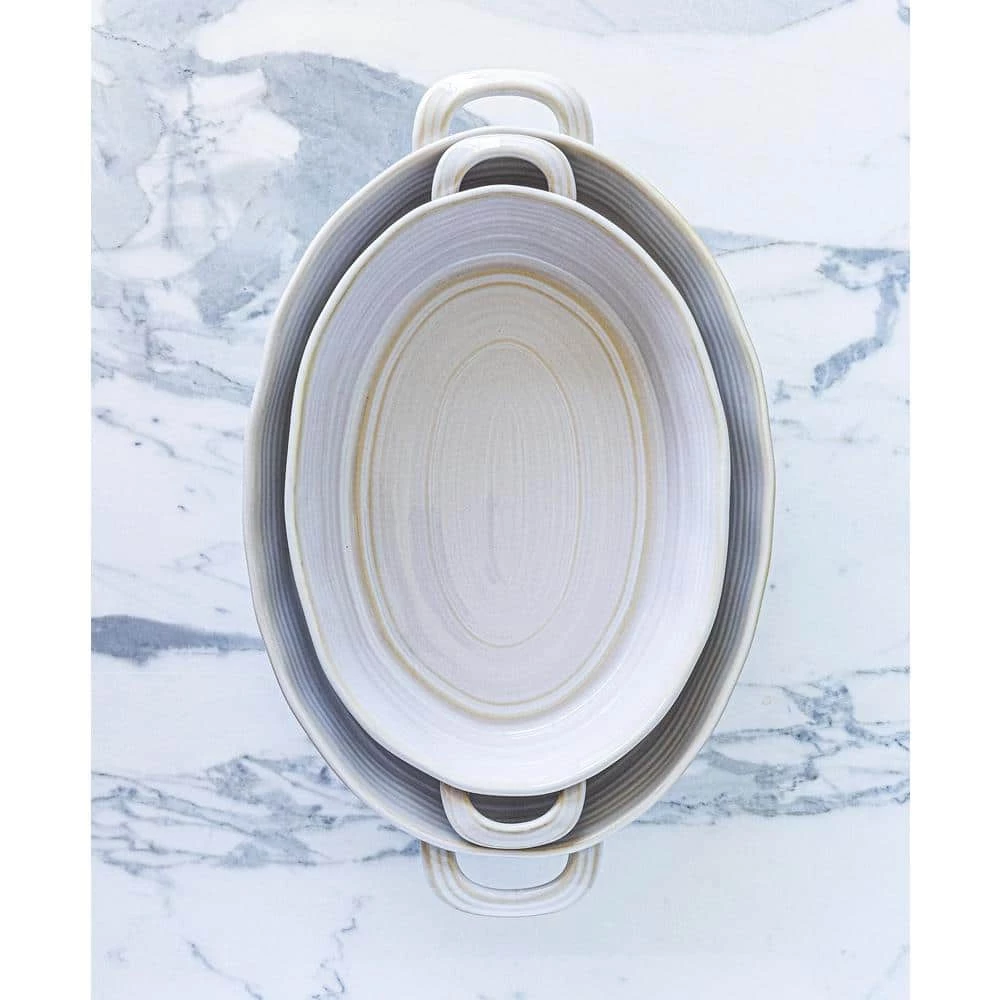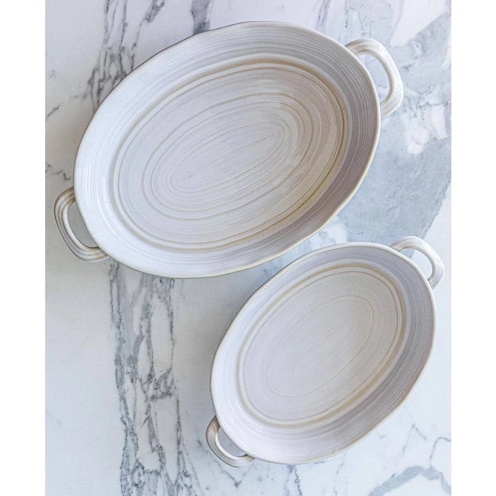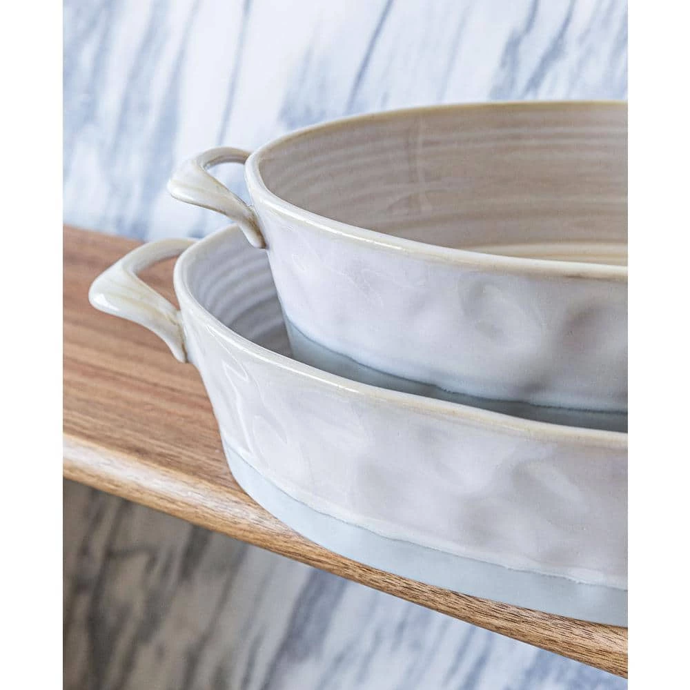 This set of 2 oval baker nesting set is the perfect over-to-table duo. Bake both savory and sweet creations. The artsansel design with dimpled texture and glaze drip adds a hand-made feel. The handles add convenience and ease. Made of Stoneware. Dishwasher and Microwave safe. Large baker: 16.65 in. x 10 in. x 2.75 in.; Small baker: 13.5 in. x 8.25 in. x 2.60 in.