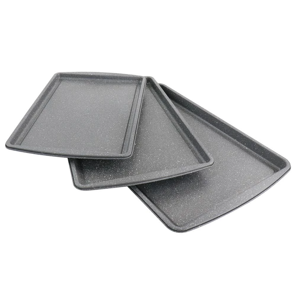 Make all your favorite cookies and entertain all your guests. Perfect for parties or any other type of events with the Oster 3-piece carbon steel cookie sheet. Comes with 3 sheets for easily preparing multiple batches to have enough for everyone. Comes with one 17 in. cookie sheet, one 15 in. cookie sheet, and one 13 in. cookie sheet.
