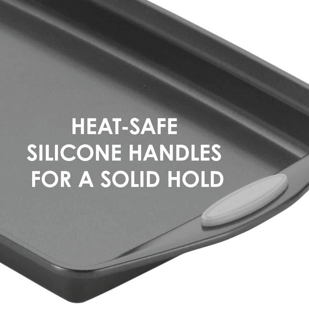 - Get a grip: bold-colored, extra-wide grippy handles on pans provide a confident grasp and are oven safe to 500°F