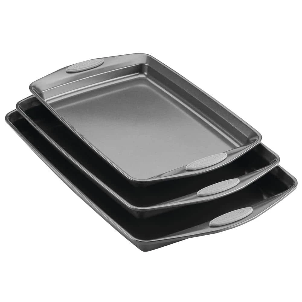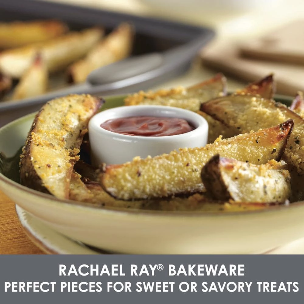 Offering three popular-sized nonstick baking pans, the Rachael Ray Bakeware 3-Piece Nonstick Cookie Pan Set is ideal for making both savory and sweet treats. These cookie pans are made from durable steel that resists warping and feature long-lasting nonstick that provides excellent food release and easy cleanup. With a small, medium, and large cookie sheet, enjoy the convenience of three sizes to do everything from using the set as roasting pans, broiling cheesy garlic bread, or baking Rachael’s Ranch-Style Potato Skins and yummy Kahlua Chocolate Chunk Cookies. The nonstick baking pans feature bold-colored, extra-wide grippy handles that provide a confident grasp when pulling items from the oven and are oven safe to 500°F. These versatile cookie pans are the perfect complement to many other pieces in Rachael’s bakeware and cookware collections that always spell fun in the kitchen. Hit a triple play with the Rachael Ray Bakeware 3-Piece Nonstick Cookie Pan Set that includes three durable baking pans for creating delish baked foods.