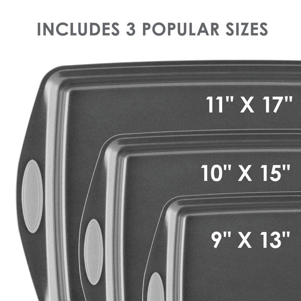 - Set includes: 9 in. x 13 in. cookie pan, 10 in. x 15 in. cookie pan, 11 in. x 17 in. cookie pan