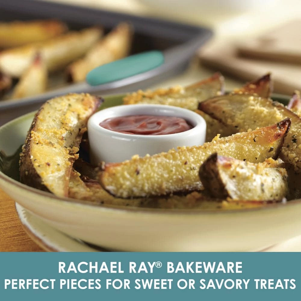 Offering three popular-sized nonstick baking pans, the Rachael Ray Bakeware 3-Piece Nonstick Cookie Pan Set is ideal for making both savory and sweet treats. These cookie pans are made from durable steel that resists warping and feature long-lasting nonstick that provides excellent food release and easy cleanup. With a small, medium, and large cookie sheet, enjoy the convenience of three sizes to do everything from using the set as roasting pans, broiling cheesy garlic bread, or baking Rachael’s Ranch-Style Potato Skins and yummy Kahlua Chocolate Chunk Cookies. The nonstick baking pans feature bold-colored, extra-wide grippy handles that provide a confident grasp when pulling items from the oven and are oven safe to 500°F. These versatile cookie pans are the perfect complement to many other pieces in Rachael’s bakeware and cookware collections that always spell fun in the kitchen. Hit a triple play with the Rachael Ray Bakeware 3-Piece Nonstick Cookie Pan Set that includes three durable baking pans for creating delish baked foods.