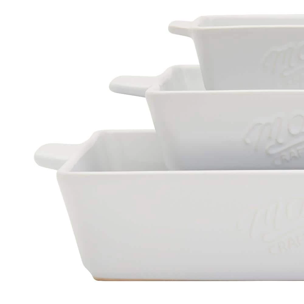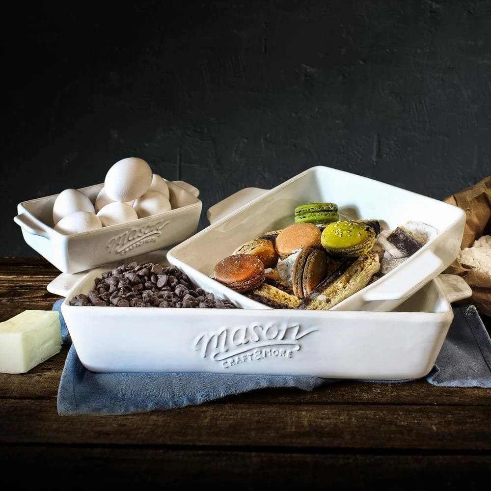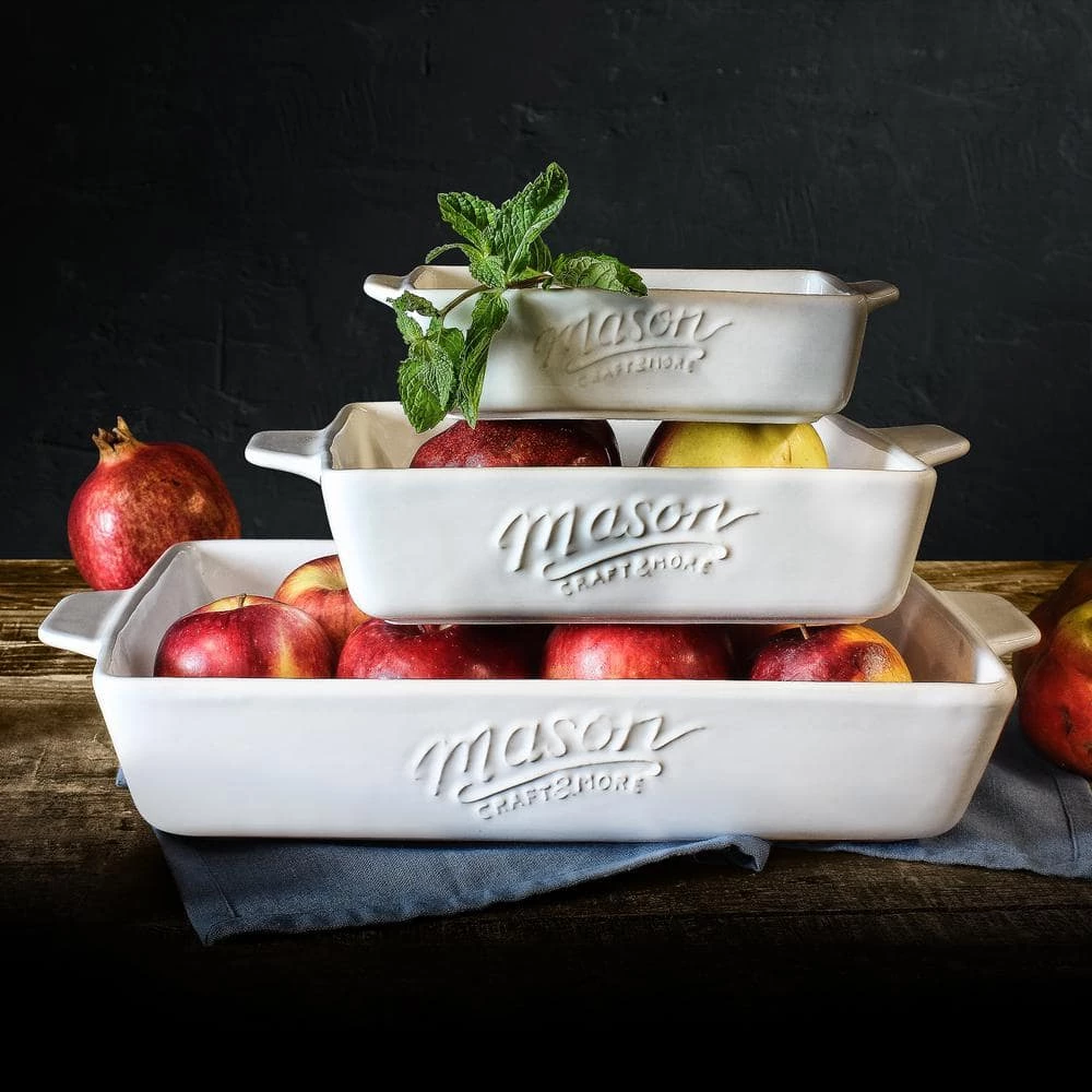 Inspired by the functionality and durability of vintage bakeware, the Mason Craft & More bakeware set delivers incredible oven to table convenience. Boasting sought-after versatility, this set is ideal for anything from delicious lasagna to delectable desserts.CONTAINS :Small Baker – 13.5″x9.75″Medium Baker – 9″x9″Large Baker – 7″x3.75″