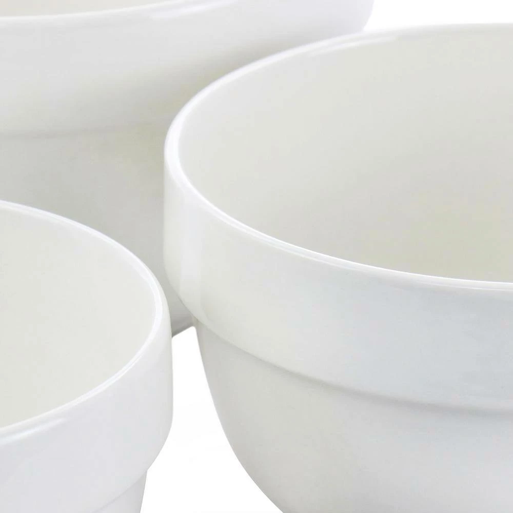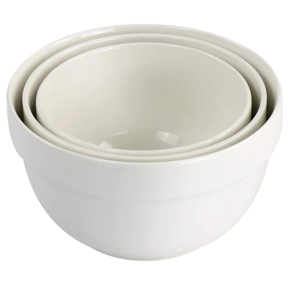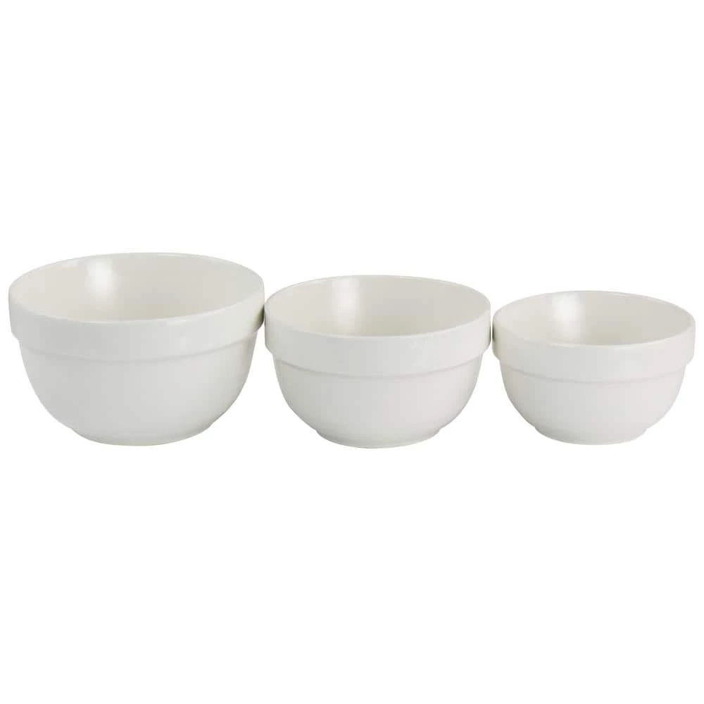 This three piece small nestable bowl set by MARTHA STEWART is constructed of fine ceramic that is durable and meant to last. This set comes with one 4.25 in. bowl, one 5in bowl, and one 5.5 in. bowl. Each bowl is perfect for single service dining- use for yogurt, cereal, salad, soup, ice cream, nuts, and other treats or snacks. Dishwasher and microwave safe for easy reheat and cleanup. These bowls are simply designed so you can fit them in with almost any dishware you already have. Classic cereal bowl shape with a thick rim and stackable design.