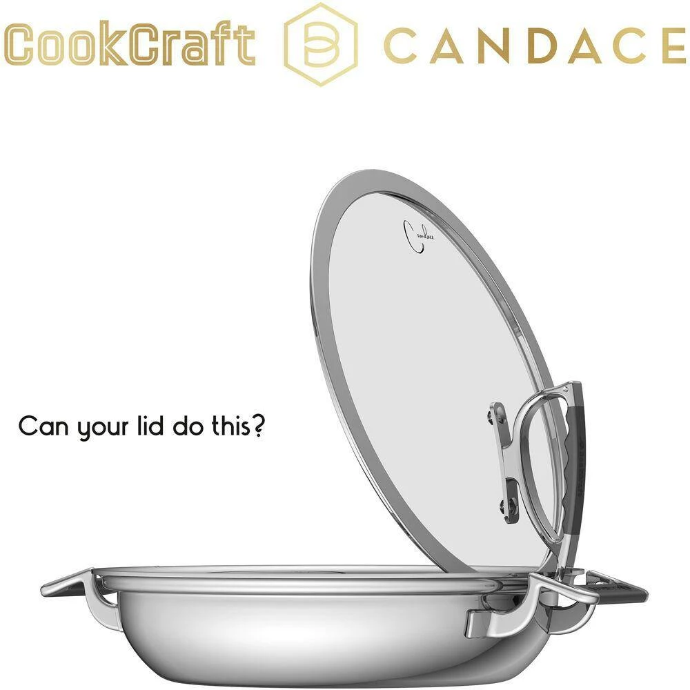 Luxurious CookCraft by Candace presents durable, high-quality cookware for the home chef who loves to create delicious culinary delights for loved ones to enjoy. Sturdy yet stylish, this long-lasting innovative cookware features a beautiful brushed finish with mirror-like accents, convenient glass lids so you can see the food as it’s cooking, and CookCraft’s unique patented latch lid that hooks on the rim of the pan, keeping your countertop spotless! Can your lid do this? This restaurant-quality cookware boasts a modern tri-ply design combining the durability of stainless steel with the excellent heat distribution properties of an aluminum core for professional results. Sleek silicone handles help prevent unnecessary burns and provide a secure, comfortable grip for ultimate control. Whether you want to cook a family-style meal or treat your friends to a fine-dining experience in your home, this versatile cookware will help you impress your guests. Savor the memories!
