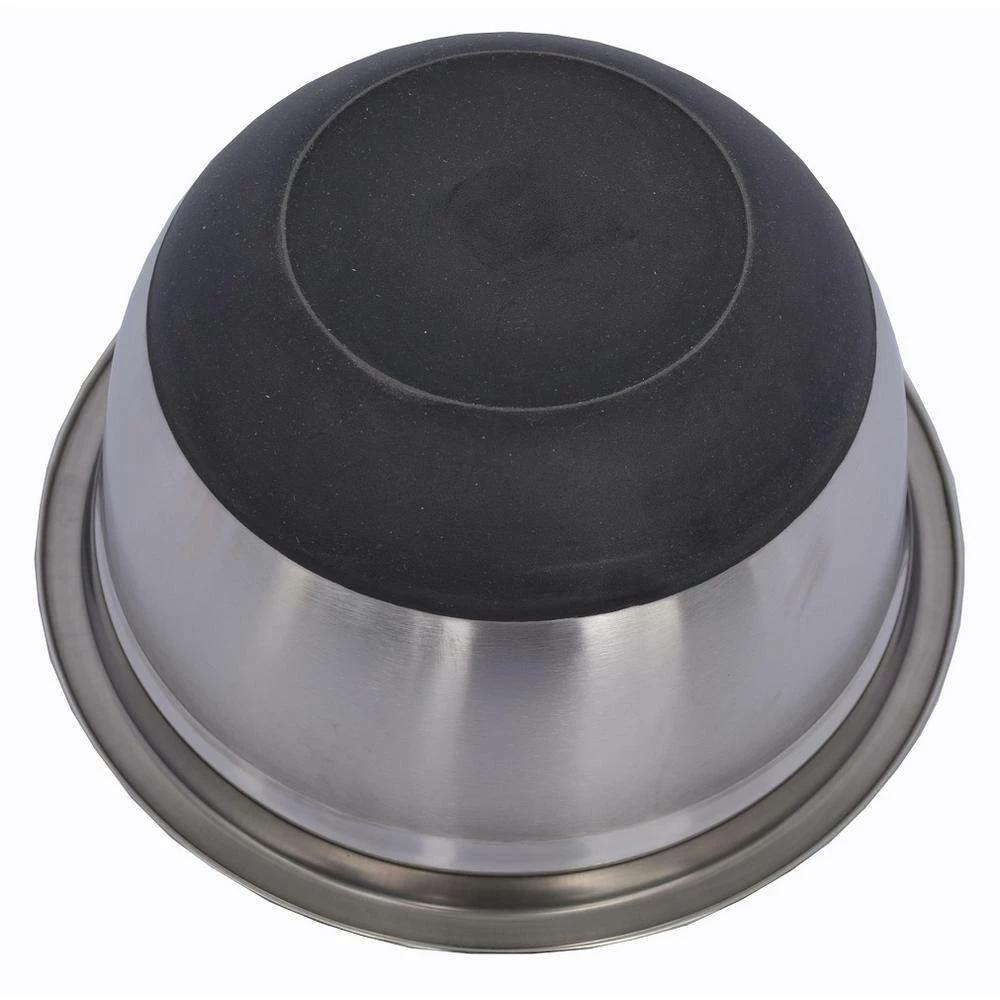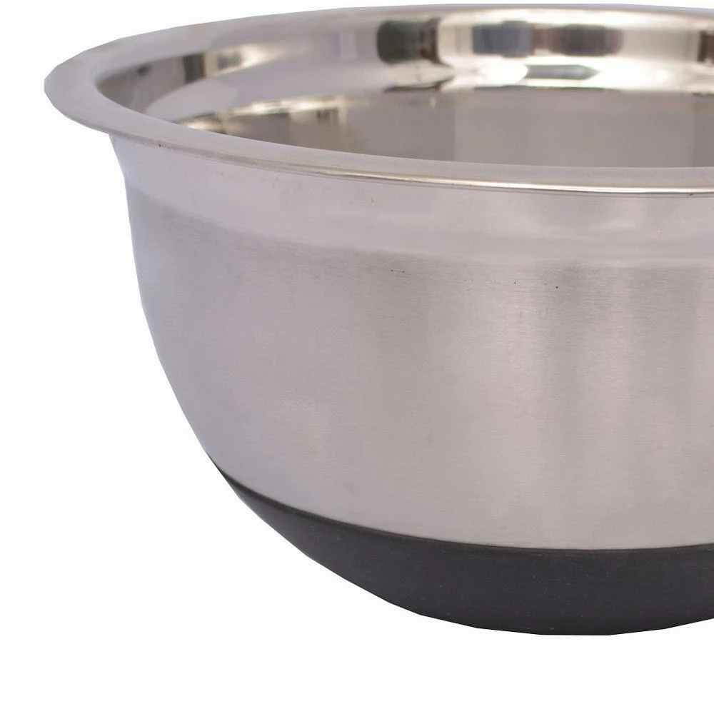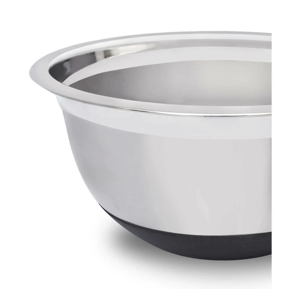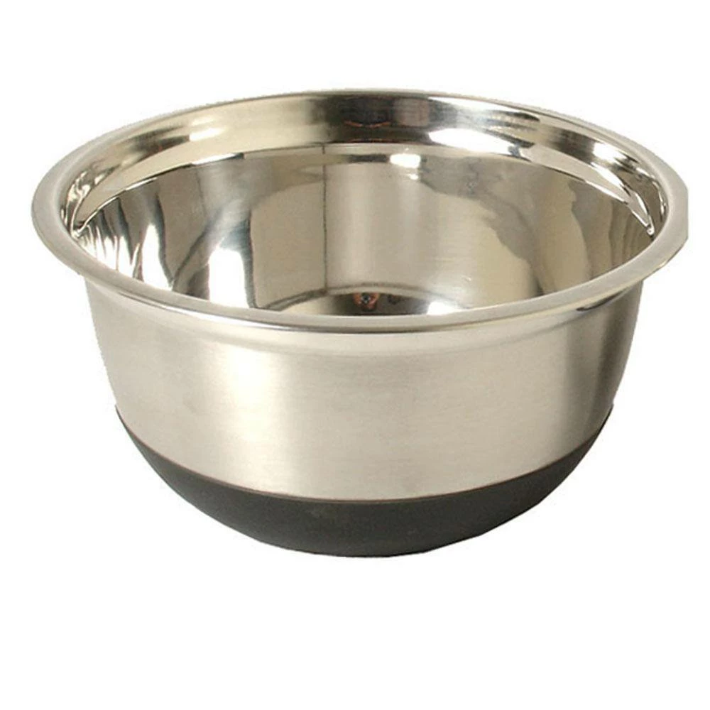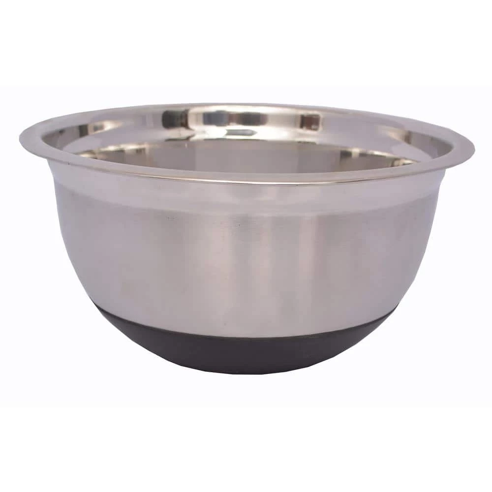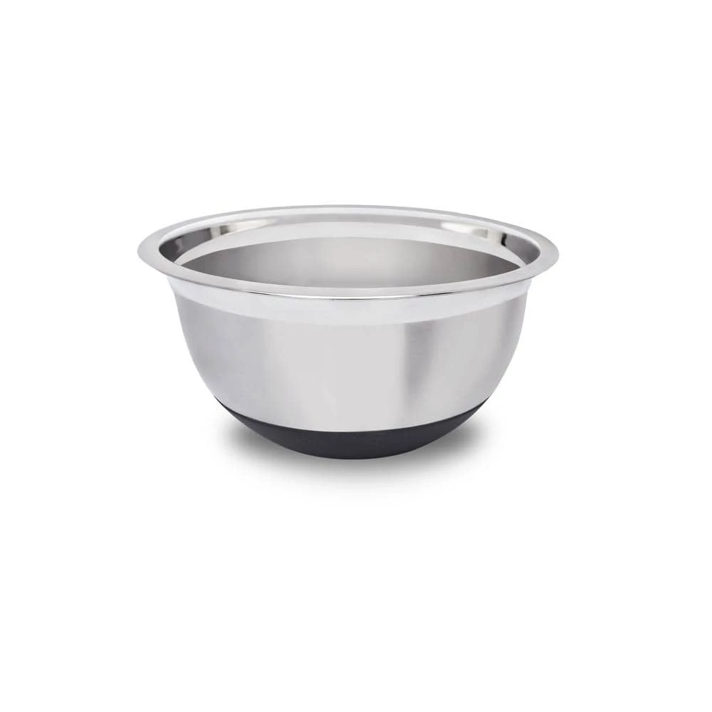 A staple for any cook, this high-quality 4.5 quart stainless steel mixing bowl with a silicone base is perfect for mixing, storing, or serving your favorite dish. The silicone base provides stable support for both hand and electric mixing tools. The deep bowl size and splatter-shield rim keep messes to a minimum.