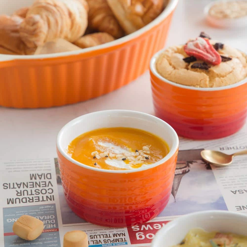 - Ramekin set, diameter 4 in is a perfect size for souffle, creme brulee, jams, dipping sauces, French onion soup, blueberry crumble