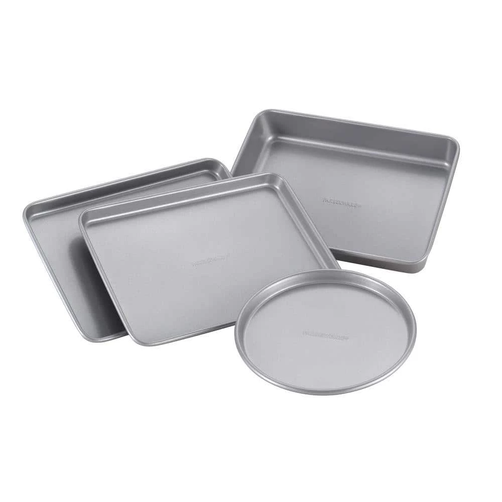 A toaster oven is a great way to save space while still being able to enjoy home-cooked pizzas, casseroles or chocolate chip cookies. These four pans are just the right size for the toaster oven and are ideal for a variety of recipes for breakfast, lunch, dinner, dessert and any snack in between. bakeware combines the quality and convenience that home cooks have come to expect since 1900. This toaster oven bakeware set features nonstick on the inside and outside for impressive food release and simple cleanup. The pans’ heavy gauge construction helps to heat evenly, so baked goods have uniform browning with each use. These pans are oven safe to 450°F and are especially designed to be used with the versatile toaster oven, so that kitchens that are short on space can still create full-sized, delicious meals.