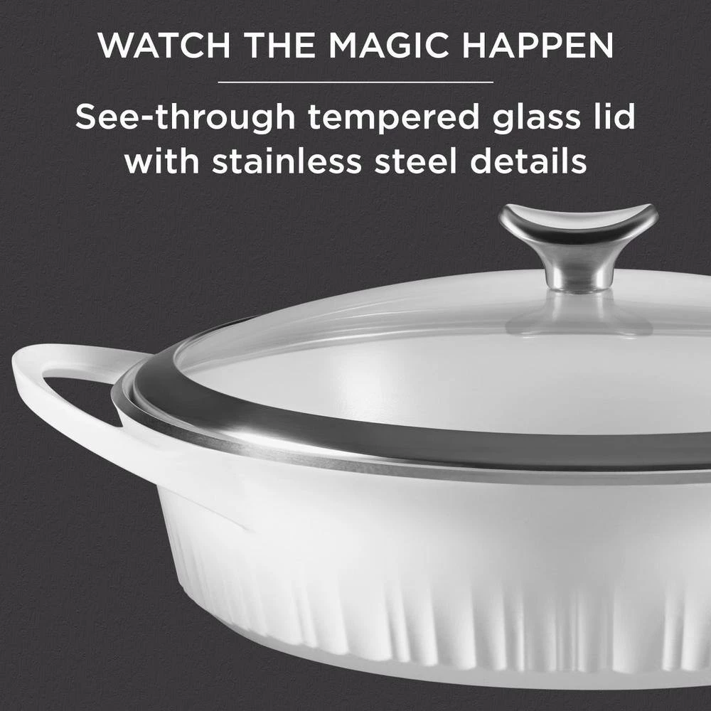 - Watch the magic happen: each cast aluminum cookware includes a tempered glass lid with tasteful stainless-steel details