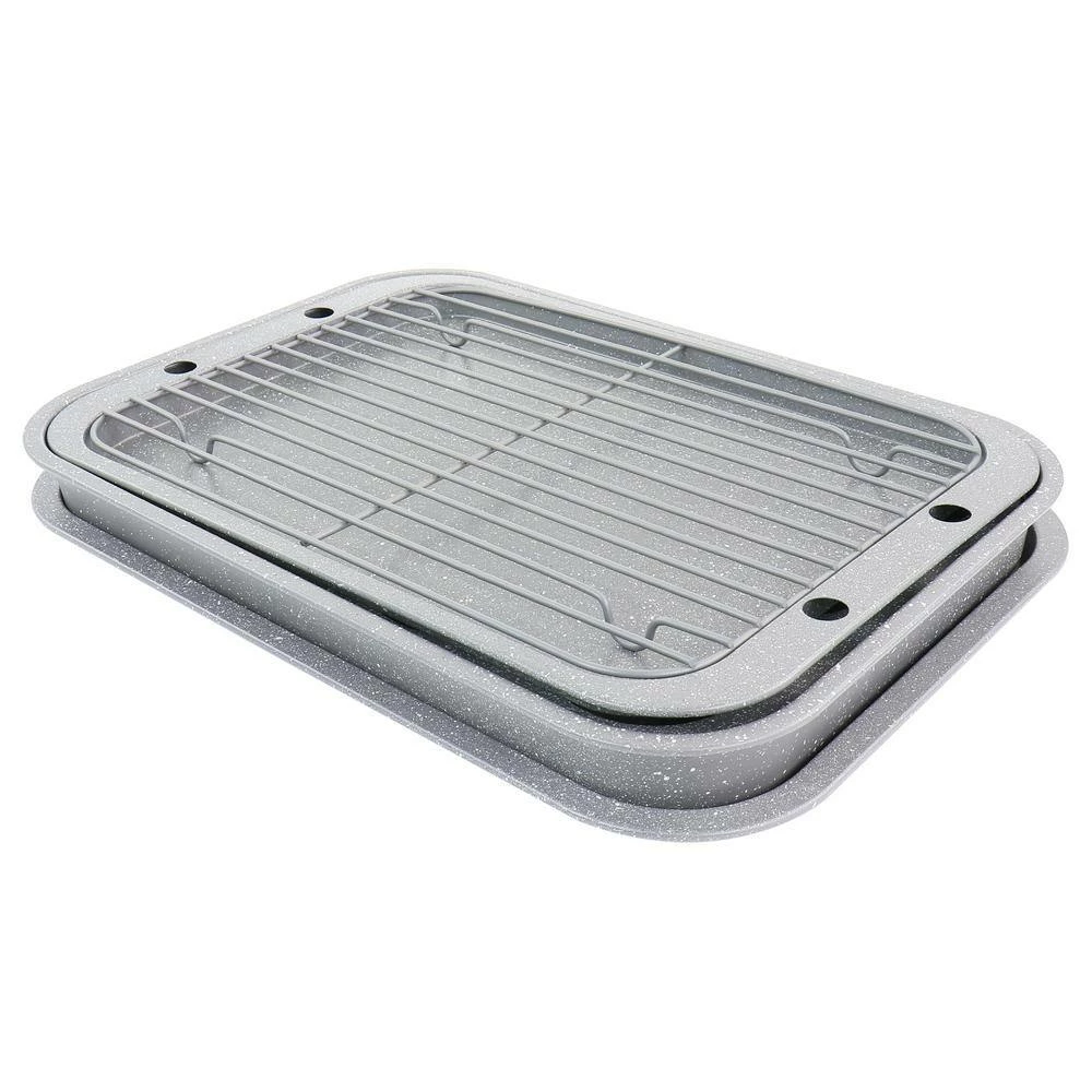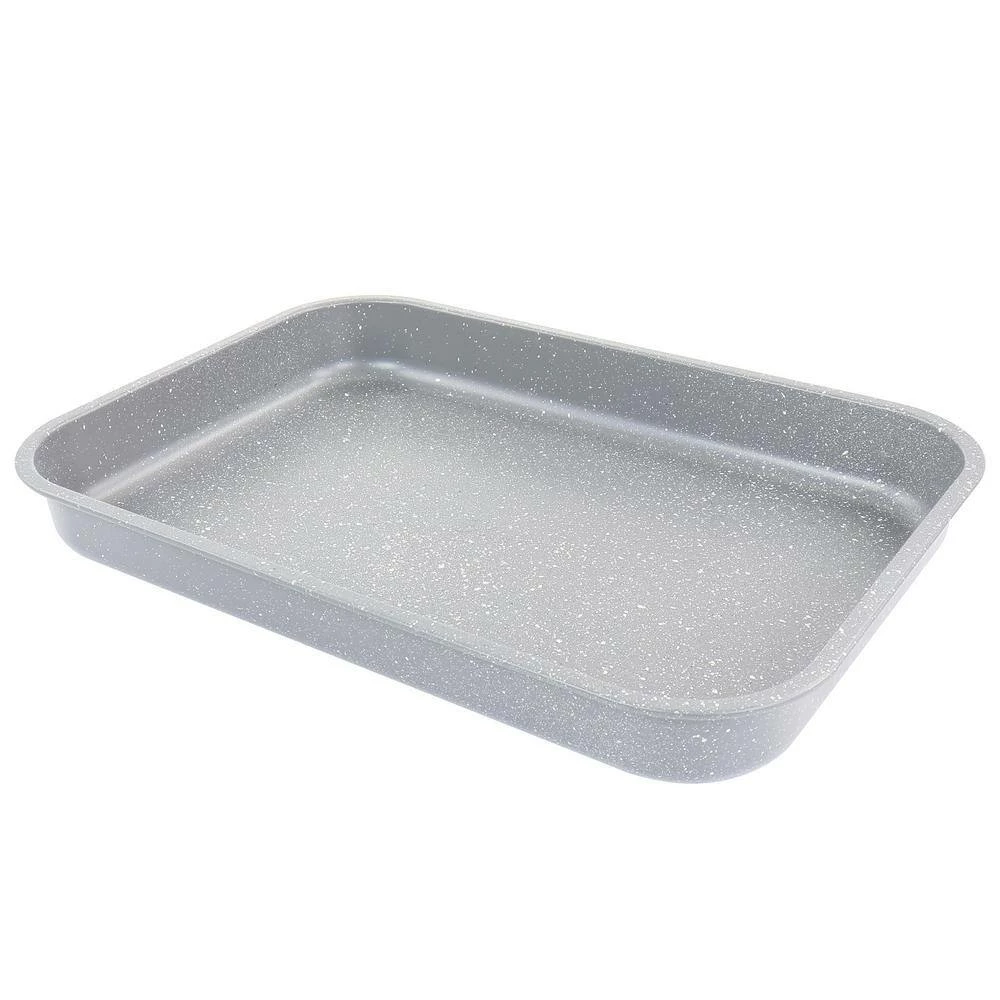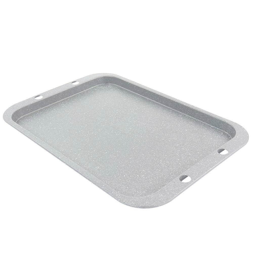 Bake up all your favorite baked goods with the Oster 5 piece roasting and baking set. Made of strong and durable carbon steel that is built to last. Featuring a beautiful greystone texture finish to give it that old fashioned look to your kitchen. This amazing set comes complete with one 15.5 in. roasting pan, one 15 in. cookie sheet, one 13.25 in. cookie sheet, one 13 in. cooling rack, and one 12 cup muffin pan. Features a non stick surface that is perfect for low-fat baking and easy clean up. All pieces can be easily stacked up for easy storage.