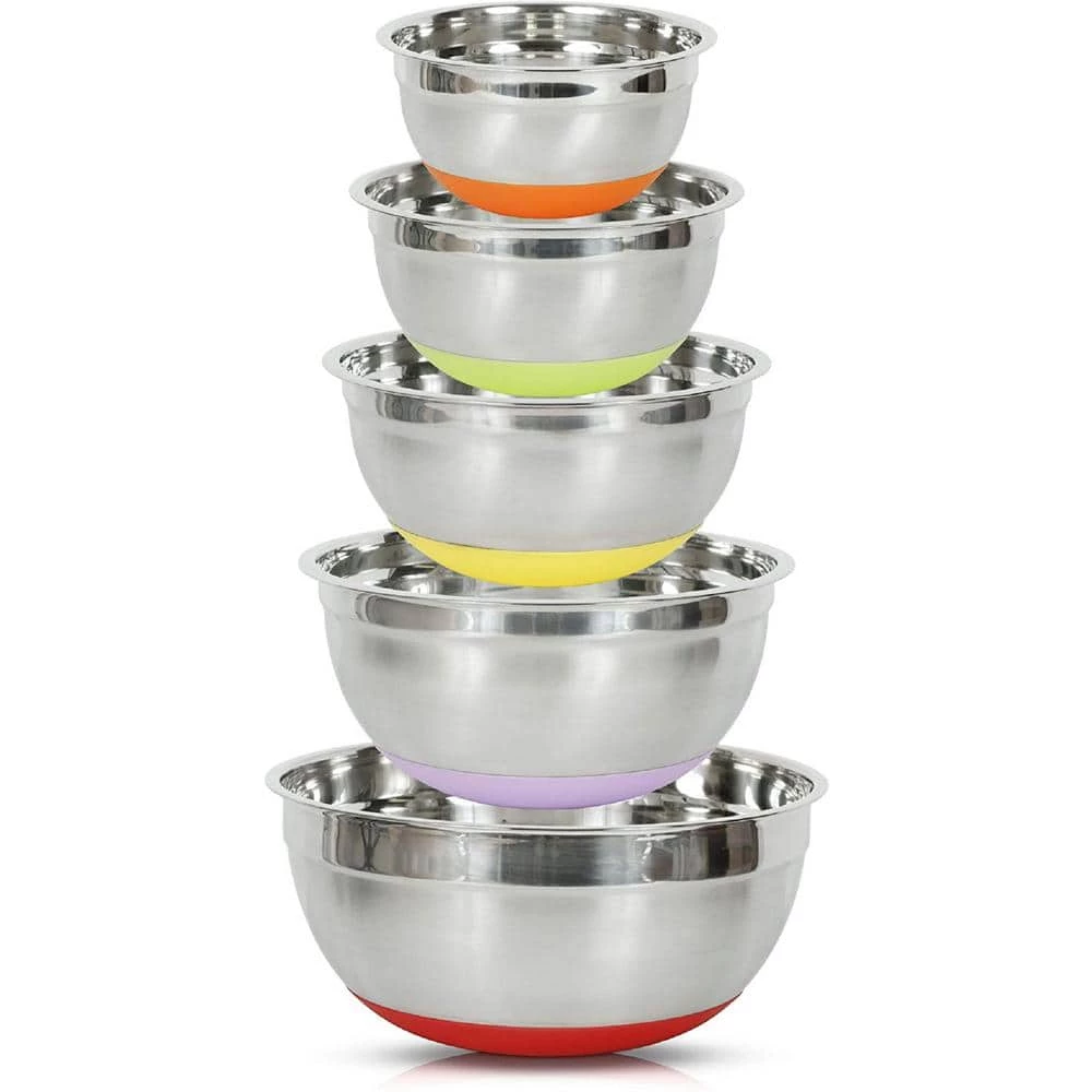 Make cooking easier – multi-purpose, stainless steel mixing bowl is essential to everyday kitchen needs. 5 different sizes will complement cooking and make cooking much easier. Ideal for making a quick salad, preparing food, or storing and serving food. Non-slip silicone bottoms are colorful and slip-resistant, keeping the bowl from moving around on the countertop, so you can easily mix all your favorite ingredients and foods. COLORFUL COOKING: Easy to identify even for kids, perfect for everyday use on your home table. Coloring your kitchen with a fresh look with these multicolor stainless steel bowls. Durable and high quality – made of high quality stainless steel for resistant, rustproof tool – mixing bowls are dishwasher safe.