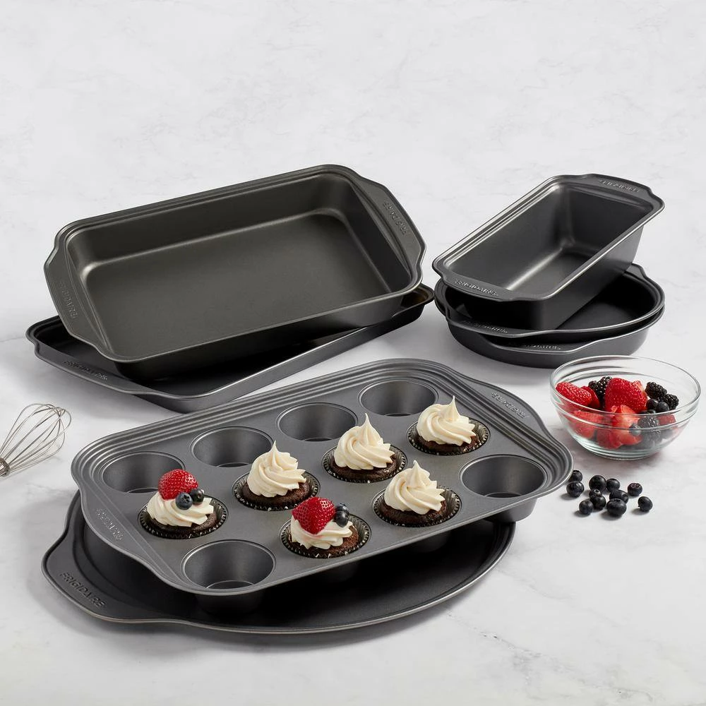Create your favorite recipes with Frigidaire Ready Bakeware. Our high performance bakeware is the perfect set for all of your baking needs. The 7-Piece set includes: 12-Cup Muffin, (2) 9 in. Round Cake Pans, 13 in. x 9 in. Rectangle Cake Pan, 9 in. x 5 in. Loaf Pans, 15 in. x 10 in. Cookie Sheet and 14 in. Pizza Pan, Oven safe (up to 450°F/232°C) enabled by carbon steel design. Easy to clean non-stick surface Dishwasher safe, but Hand wash is recommended and Dry immediately.