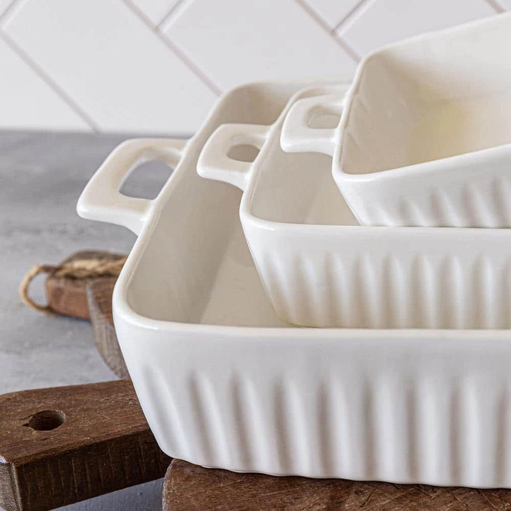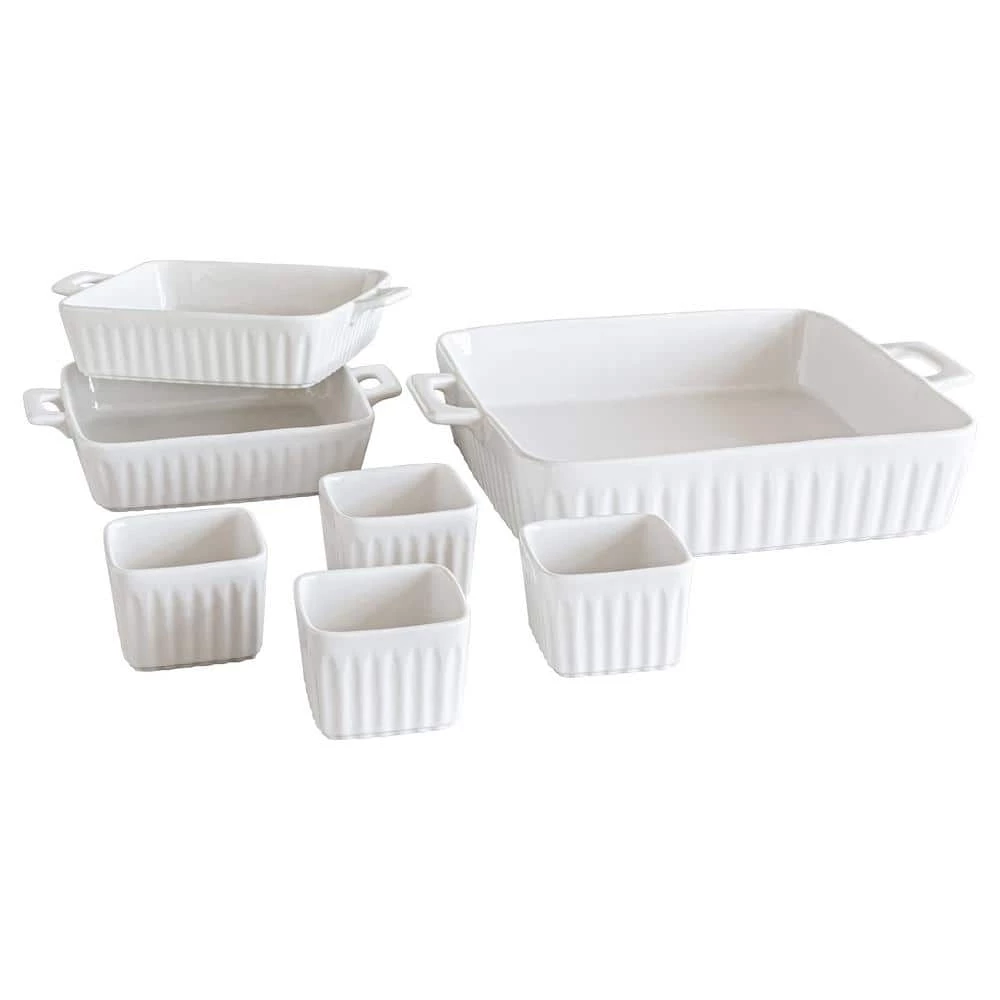 A perfect set for the series baker or someone who is just getting started. This set includes all the essentials to create an array or sweet desserts and savory dishes alike. The creamy porcelain is adorned by verticle flutting adding to the beauty and of this simple yet elegant set of bakers. Set includes 1 small handled baker (13.54 in. x 10.82 in. x 2.71 in.), 2-small (individual-sized) handled bakers (9.05 in. x 7.00 in. x 2.00 in.), 4-square ramekins (3.07 in. x 3.07 in. x 2.16 in.).