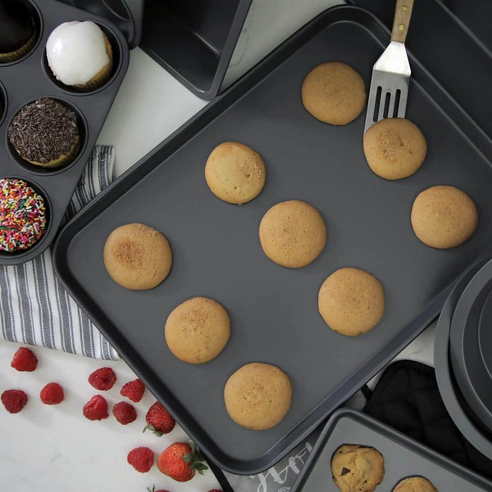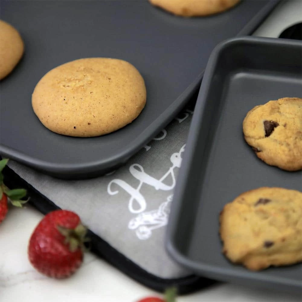 - Includes: large roasting pan-1, 8 in. square cake tin-1, small oven tray-1, muffin pan-2, 8 in. round cake tin-2, large oven tray-1