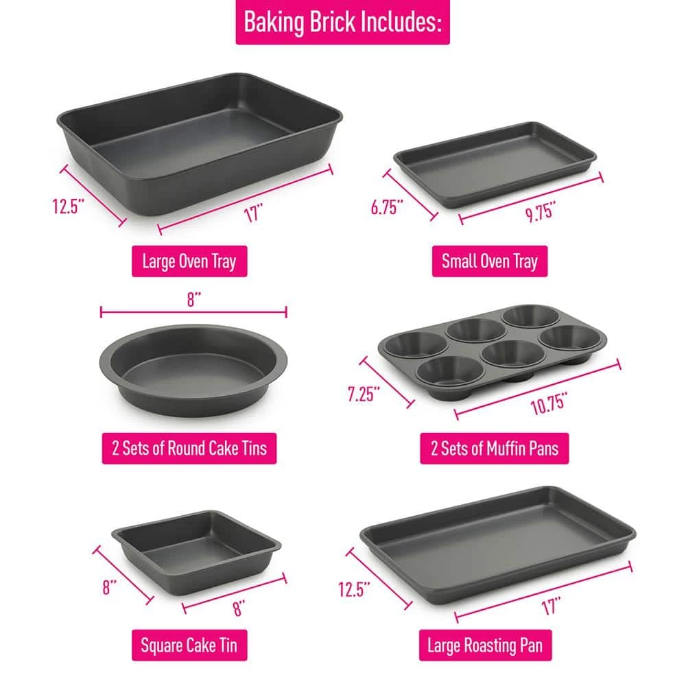 The revolutionary baking brick set from ELBEE Home comes with every item you need to be a pro baker. The baking brick set includes one large roasting pan, one 8 in. Square cake tin, one small oven tray, two muffin pans, two 8 in. Round cake tins, and one large oven tray for anything you can imagine making in the kitchen. What makes the baking brick so revolutionary. Every item in the brick was designed to store neatly within itself, saving you valuable cupboard space. The baking brick set is roughly 1.5 sq. ft. Meaning the brick will fit neatly into most cupboards or oven drawers. The baking brick set is dishwasher safe and coated with an anti-stick finish, making it the perfect baking set for professional and amateur bakers alike.