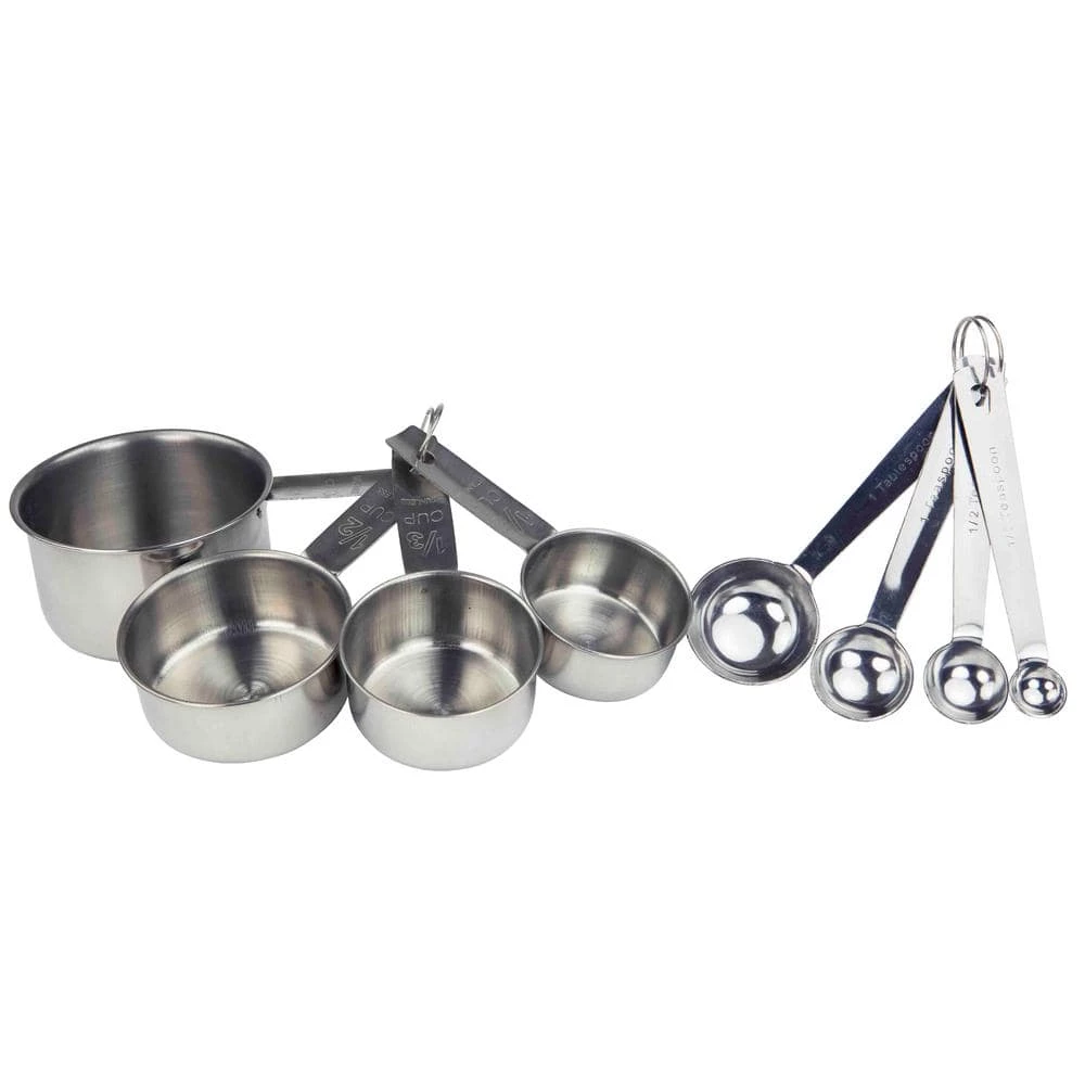 - Nested set includes 4 measuring cups (1/8, 1/4, 1/2, 1 and) 4 measuring spoons (1/2, 1 table spoon, 1 tsp, 1/2 tsp, 1 table spoon)