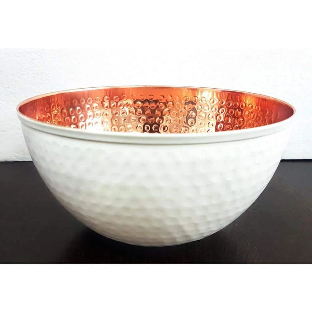 This beautiful hammered 100% pure copper bowl features white powder coating on the outside and is the perfect addition for your kitchen. Use as a mixing bowl, for beating eggs, and serving your favorite dish, salad or appetizer. Not only does it have many practical uses, it looks great and adds extra style to any meal. It’s particularly ideal for parties, events and holidays. This handcrafted metal bowl can also be used as a decorative item in any room in your home. Perfect for adding a little extra style and flair to any coffee table or side table. Get one for yourself and another for a family member or friend. Perfect for Christmas, holidays, house warming, thank you, weddings, birthdays, Mother’s day and more. This pure copper bowl is coated with a food-safe lacquer to resist tarnish and maintain its beauty and lustre for years to come. Please hand wash only using warm water and soft soap. Do not scrub. Not suitable for dishwasher or microwave use.