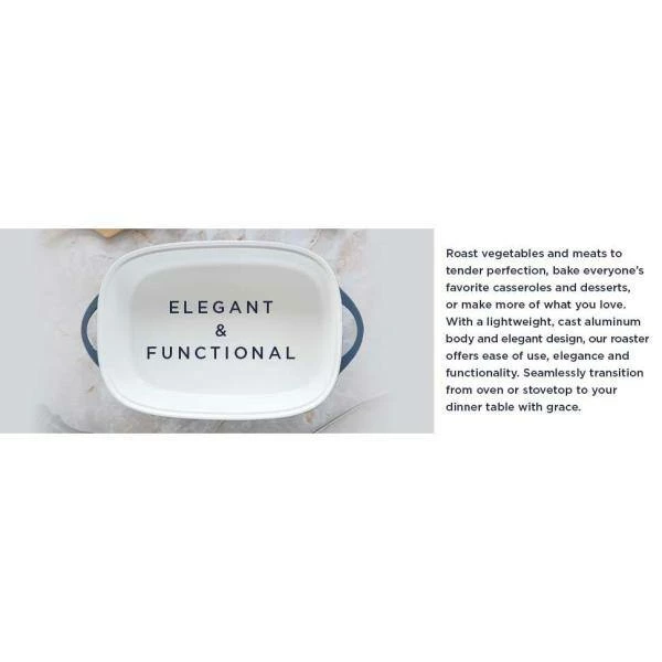 Our 5.7-quart Cast Aluminum Roaster is 30% lighter than traditional cast iron cookware and offers superior, even heating performance. It’s easy to store in overhead cabinets and the non-stick ceramic interior makes it easy to clean. The roaster’s timeless design is perfect for entertaining guests, allowing you to seamlessly transition from oven to table.