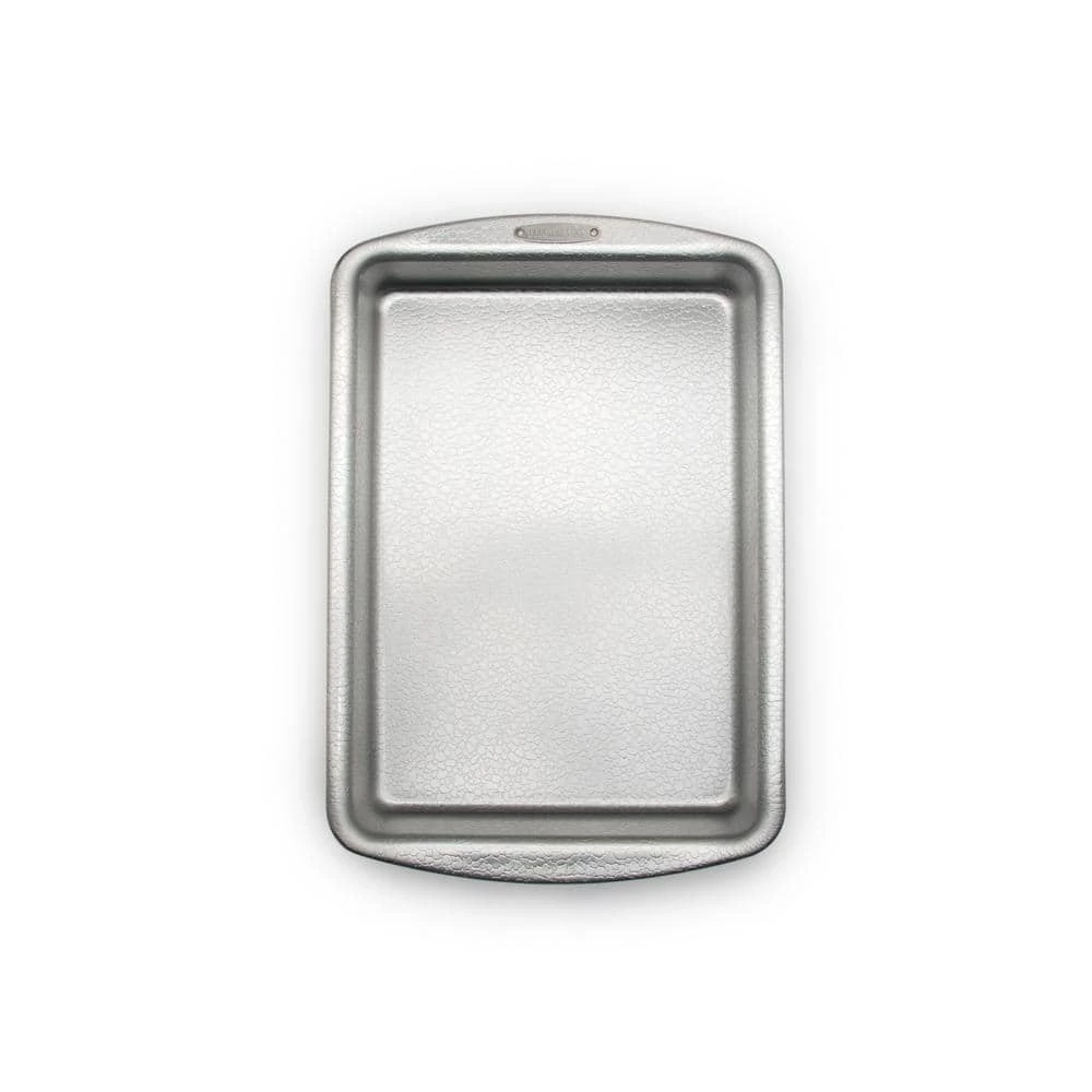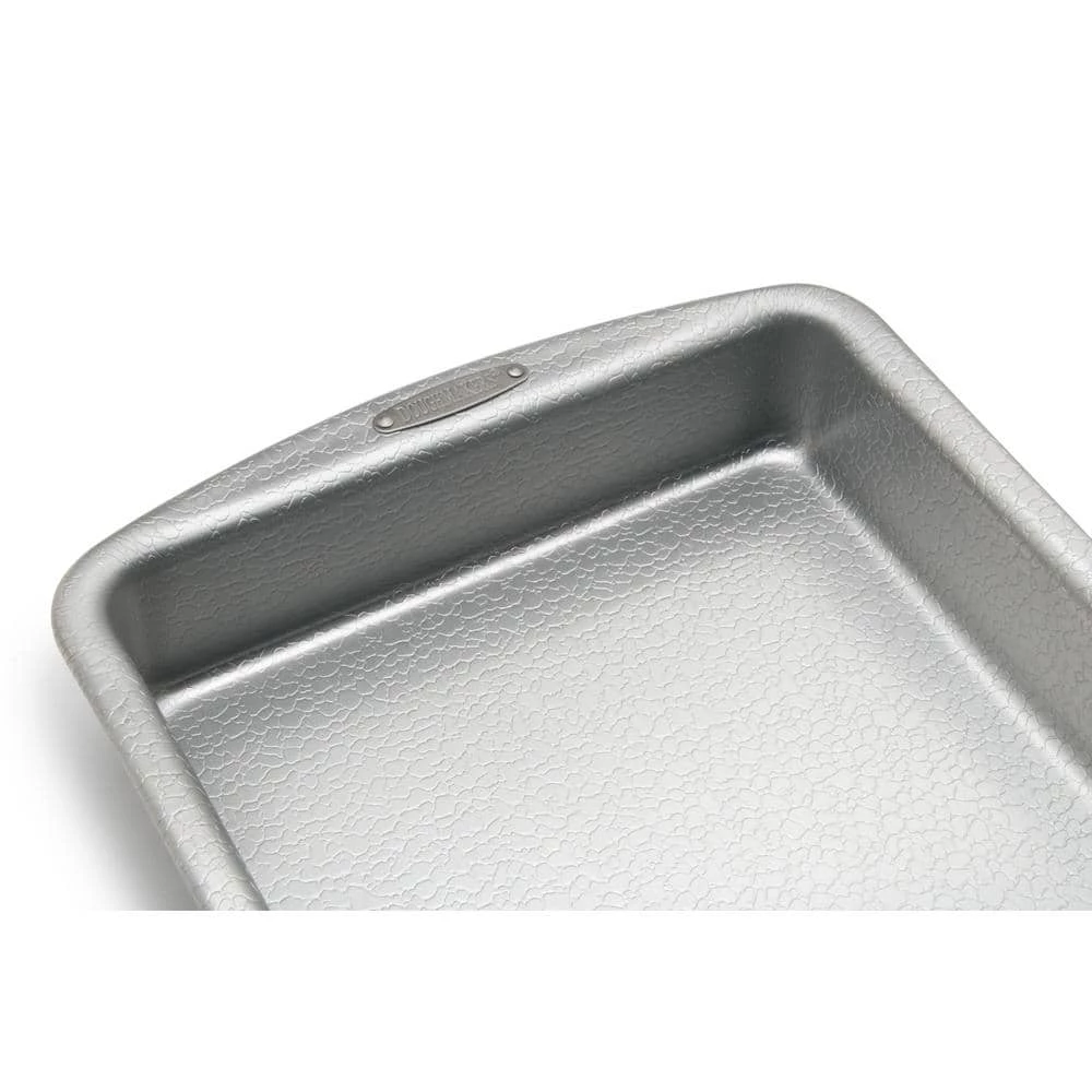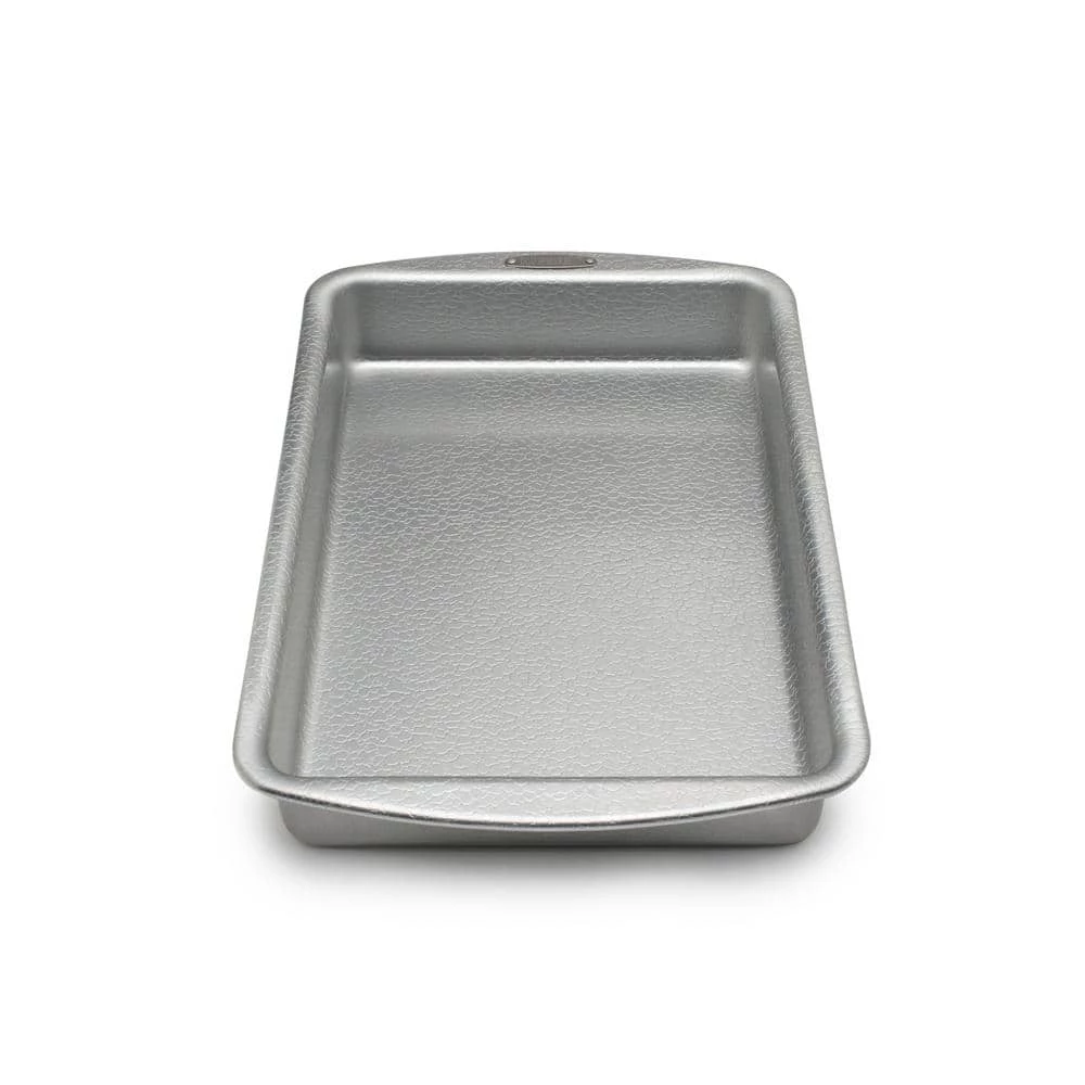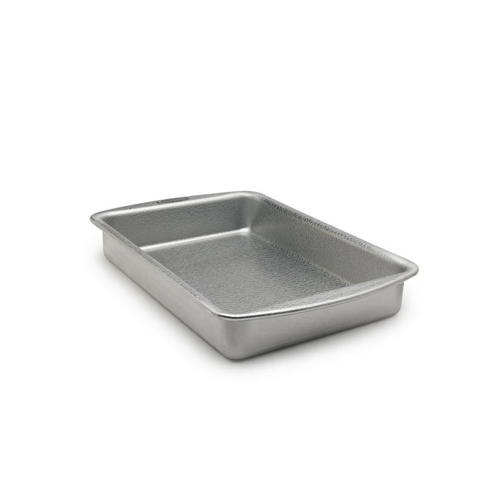 Want to bake like a professional in the comfort of your own home? Our 9 x 13 in. Cake Pan is great for making beautiful layer cakes. Made of premium heavy gauge, recyclable aluminum with strengthened handle areas, the pan features our original pebble pattern, which allows for airflow under baked goods for more even browning and quick release. This non-coated bakeware’s unique, natural non-stick properties means consistent, reliable and healthy results every time. The embossed pattern is also useful when greasing and flouring: it will help hold a bit of shortening that might otherwise be wiped off.