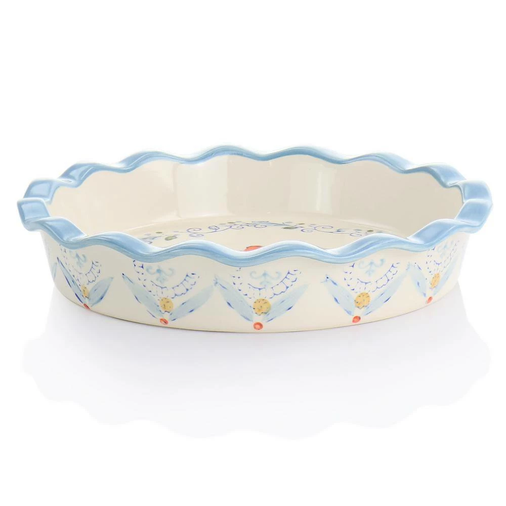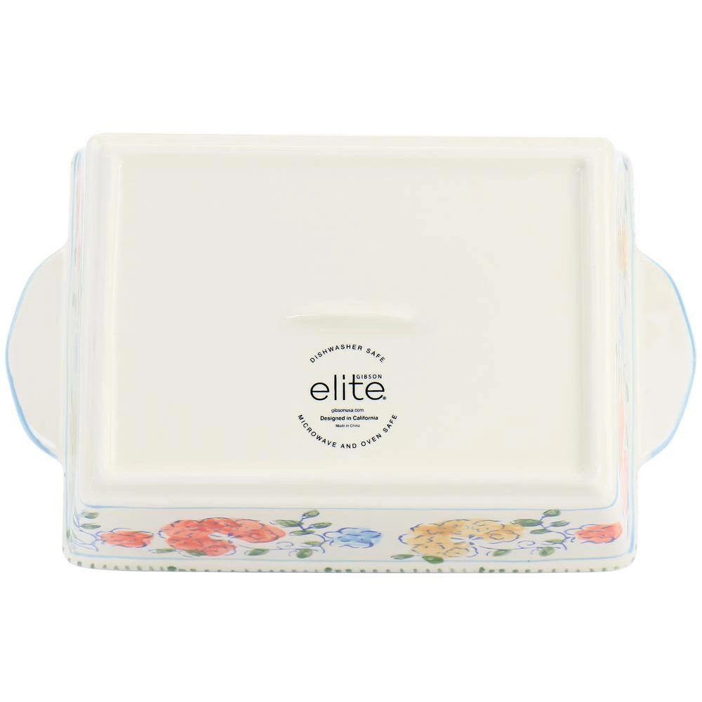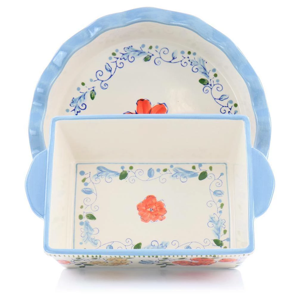 Warm up the kitchen with baked goods made in the Gibson Elite Anaya 2 Piece Stoneware Bakeware Set. Featuring a pie pan and a loaf pan covered in hand painted floral designs. Their stoneware bodies are oven safe and microwave safe for all sorts of baking and heating activities. The set is also dishwasher safe for easy cleaning afterwards. Bake yummy banana bread, savory casseroles, or the prefect apple pie.
