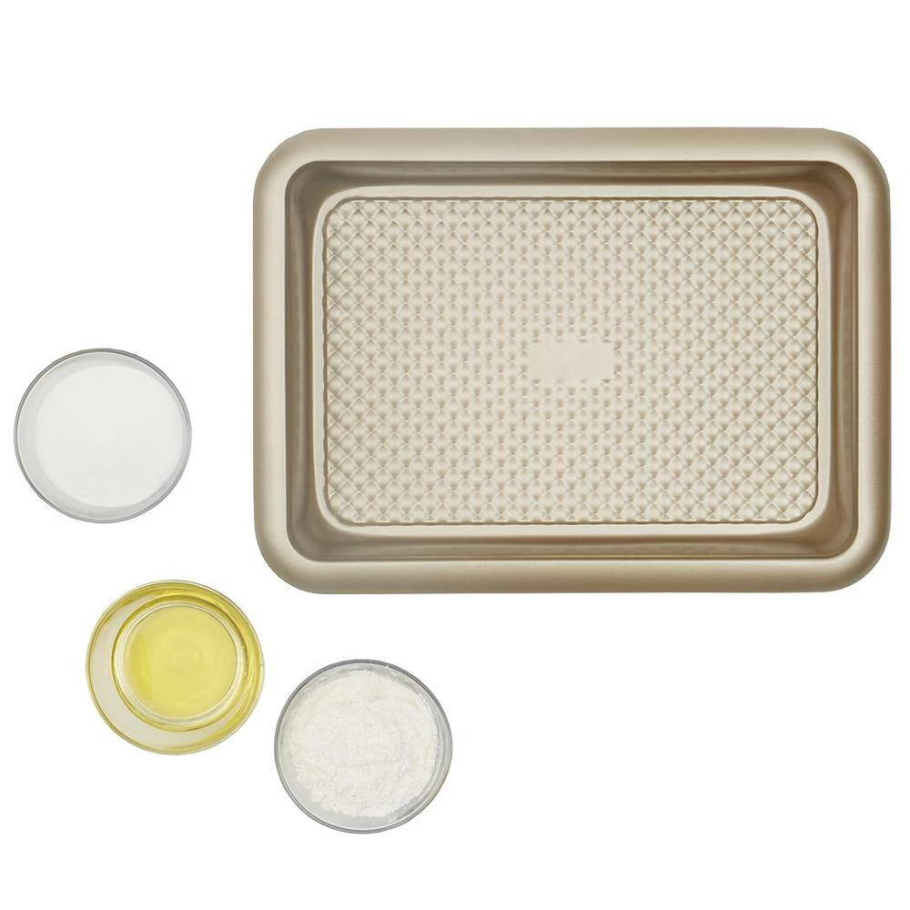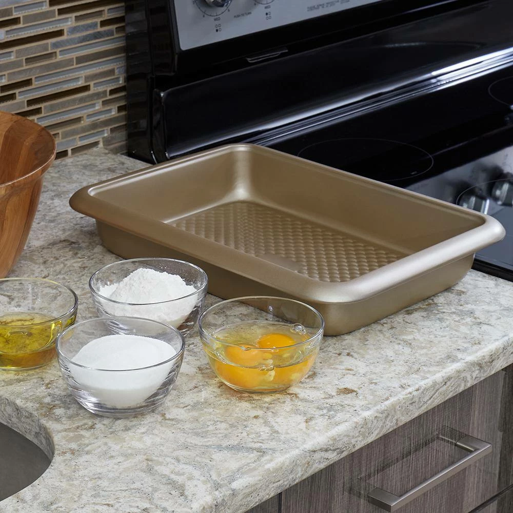 If you’re looking to cook a large cut of meat, you’ll appreciate the durability and non-stick convenience that this textured deep roaster pan brings. Its superior carbon steel construction dispersing heat evenly, yielding meats with just the right amount of crispiness and golden skin. Tall side walls prevent liquids from splashing over. Non-stick design provides exceptional food release for quick clean up after every meal. Its rectangular shape provides versatility allowing you to cook more than one item. Wide sides provide a great grip when transferring in and out of the oven. Oven safe up to 220 degrees Celsius/428 degrees Fahrenheit. PFOA, PFTE, and BPA Free. Dishwasher safe. Item dimensions may differ slightly due to the unique nature of the product. Color and finish may also differ from the images shown due to differences in monitor displays. Props and accessories are not included.