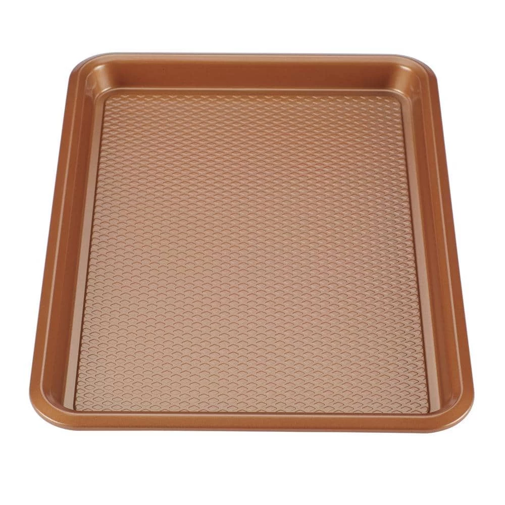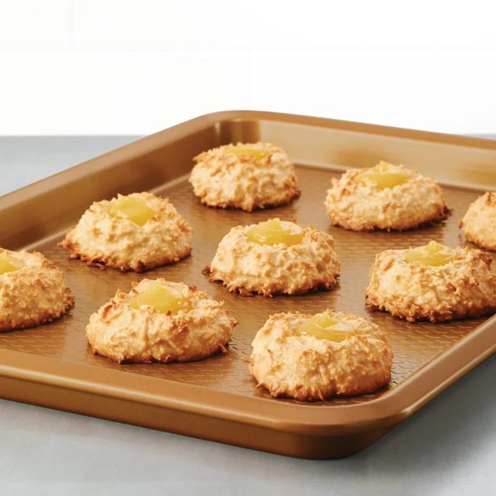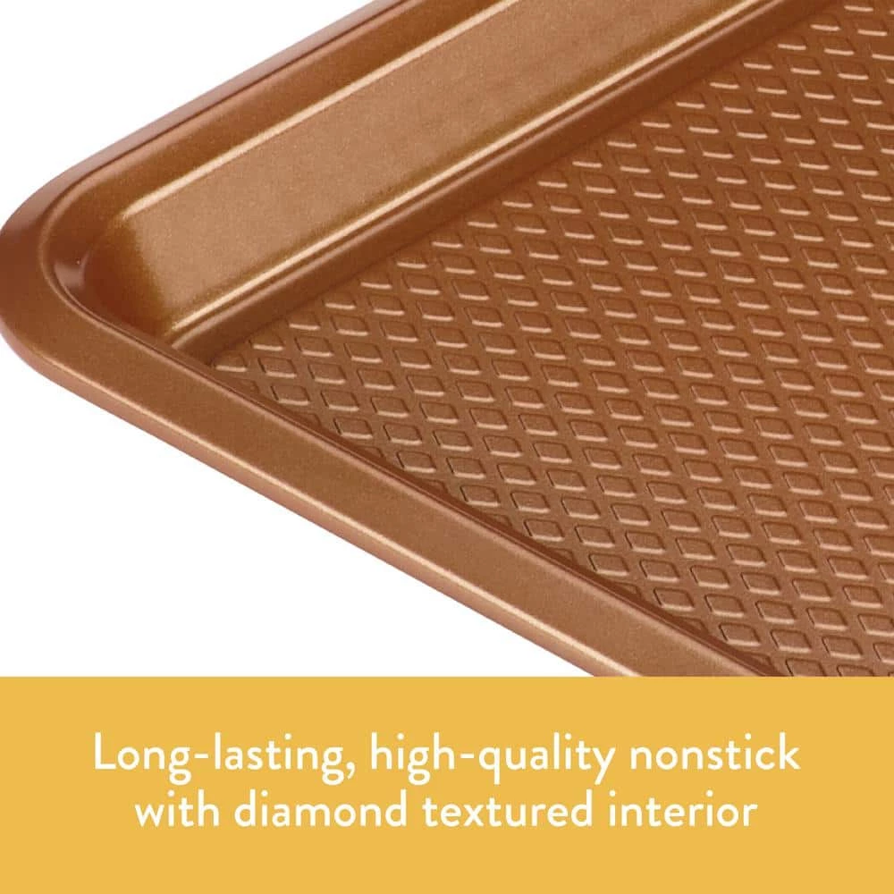 Make a triple play of oven-baked chicken tenders, soft and chewy chocolate chunk cookies, and a family sized batch of loaded potato jackets using the Ayesha Bakeware Nonstick 3-Piece Cookie Pan Set.Constructed from durable, high-performance steel, this set of cookie pans in three essential sizes boasts excellent resistance to warping and bending for great results, recipe after recipe. A textured diamond pattern assists with both enhanced browning and easy food release, so buttery baked goods brown evenly and don’t stick to the pan. Extended edges provide a sure and sturdy grip for pulling a batch of crispy French fries off the center rack or for tossing broccolini in mid-roast. Oven safe to 450F, the cookie pans are suitable for a wide range of sweet and savory recipes, and feature a high-quality nonstick coating for healthy cooking and long-lasting performance. They’re dishwasher safe, too, so weeknight meals and signature recipes like Ayesha’s Brown Sugar Bacon Bites turn out Instagram-ready with easy cleanup (hand wash recommended to prolong product life). Plus, this Ayesha Curry kitchenware helps support No Kid Hungry to provide up to 500,000 meals to children in need. Learn more at nokidhungry.org/onedollar.Grab your Ayesha Cookie Pan triple pack today and unleash the stylish simplicity in your baking.