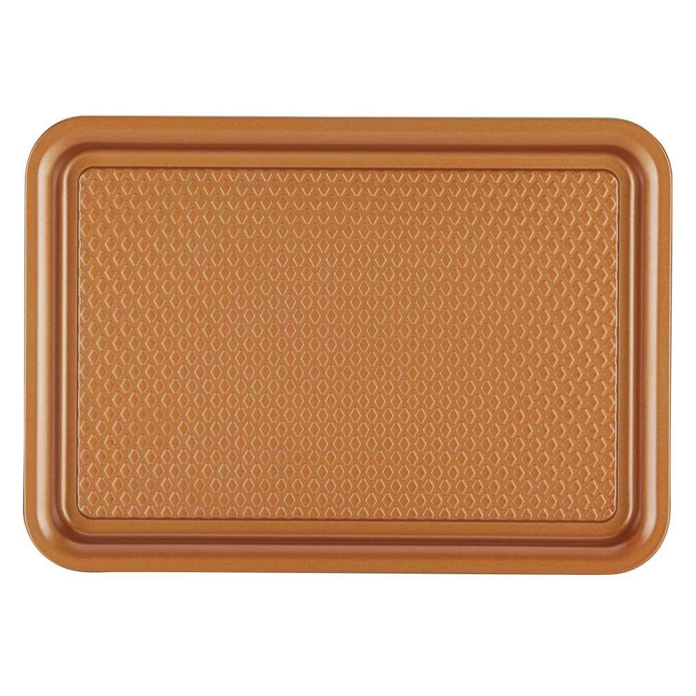 Put that toaster oven to work (or simply bake smaller portions in a normal oven) with the Ayesha 4-Piece Toaster Oven Bakeware Set, featuring a two cookie pans, a cake pan, and a 6-cup muffin pan all sized down to 10.25 in. x 7 in. dimensions.Constructed from high-performance steel, this mini-me set has everything you need for toaster oven baking and features excellent resistance to warping and bending for great results, recipe after recipe. A diamond textured surface assists with both enhanced browning and easy food release, so chicken tenders and soft and chewy chocolate chip cookies cook evenly and a mini zucchini bread or confetti cupcakes don’t stick to the pans. Generous edges provide a sure and sturdy grip, and this Ayesha Curry kitchenware helps support No Kid Hungry to provide up to 500,000 meals to children in need. Learn more at nokidhungry.org/onedollar.Oven safe to 450F, the mini toaster pans are suitable for a wide range of sweet and savory recipes, and feature enhanced nonstick coating for healthy cooking and long-lasting performance. The pans are also conveniently dishwasher safe for easy cleanup (hand wash recommended to prolong product life). Perfect for the dorm, a first apartment, cooking with the littles or just toasting up some good fun, let the bake-off begin with the Ayesha 4-Piece Toaster Oven Bakeware Set.