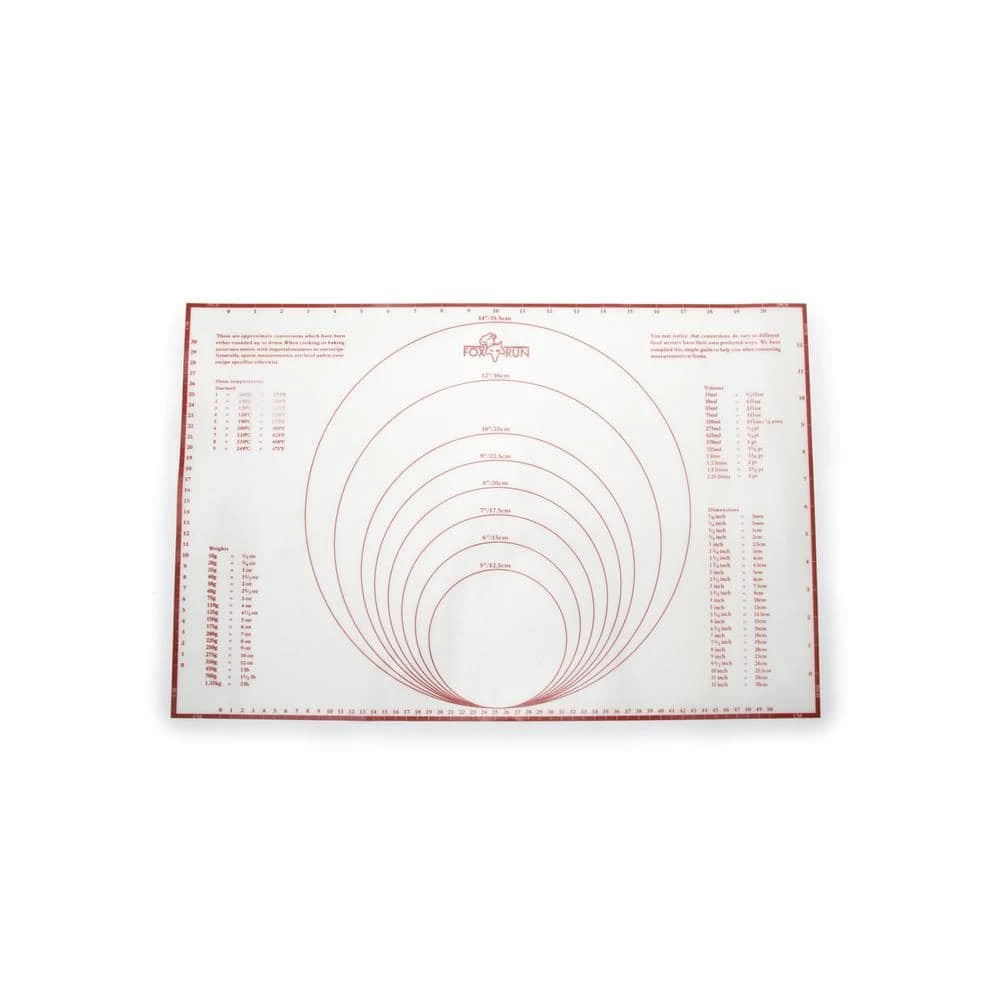 Eliminate the need for parchment paper and greasy cooking aids with this Non-Stick Baking Mat. Made from food-grade silicone and reinforced with glass weave, this mat is designed for all oven types and provides even heat distribution to your baked goods to prevent any burning. The mat features an extensive measurement guide including measurements in inches and centimeters, diameter in inches and centimeters, temperature conversions of Celsius and Fahrenheit, weight conversions of g/kg and oz./lb., and volume conversions of ml/l and fl oz./pt. Makes an ideal surface for dough prep and is a perfect accessory for any baker. The non-stick finish allows easy cleanup, and items can also be laid on the mat and frozen for later use. The mat can withstand temperatures from minus 40°F to 480°F. Perfect for way more than just rolling out pastry dough.