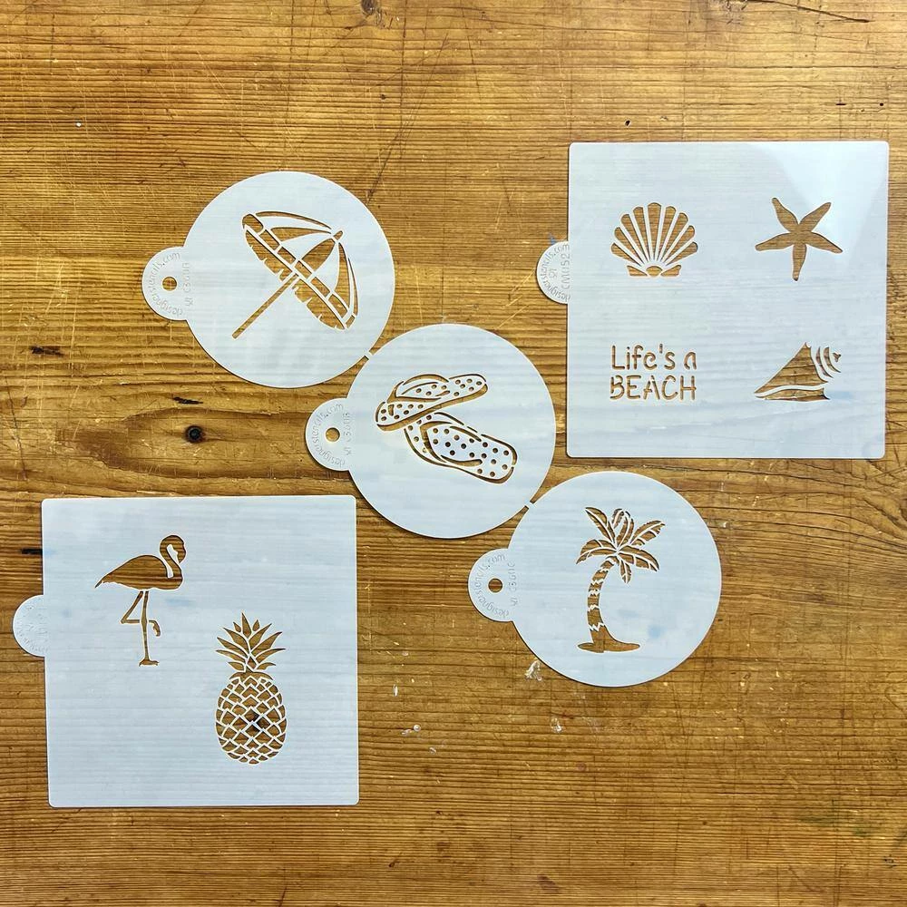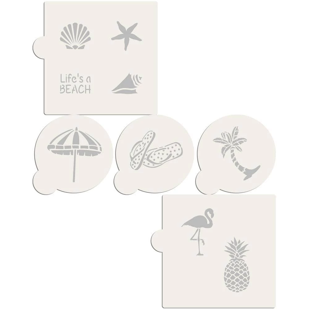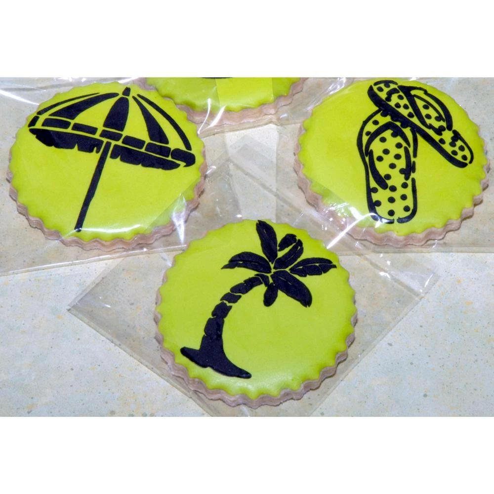 This bundle gives you 9 different beach themed patterns for decorating your circle cookies. 1 set of 3 stencils include flip flops, palm tree, and beach umbrella. The set of 4 stencils include 3 seashell designs, and Life’s a BEACH lettering. The last set of 2 stencils include a pineapple, and a flamingo. Cut on durable, 10 mil food grade plastic, each stencil circle is 3.75 in. high to fit a 3 in. to 4 in. circle cookie cutter. The stencil rectangle is 5.5 in. high, but the individual designs on the stencil will fit a 2 in. to 4 in. circle cookie cutter.