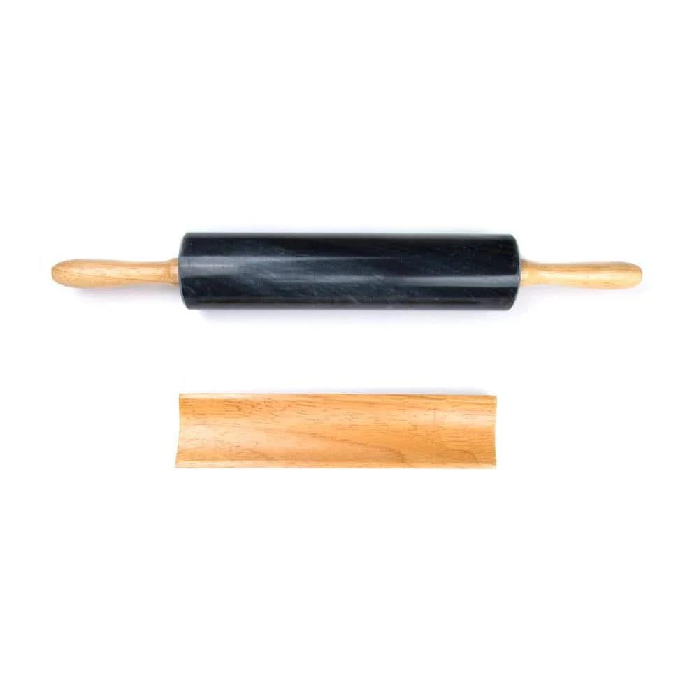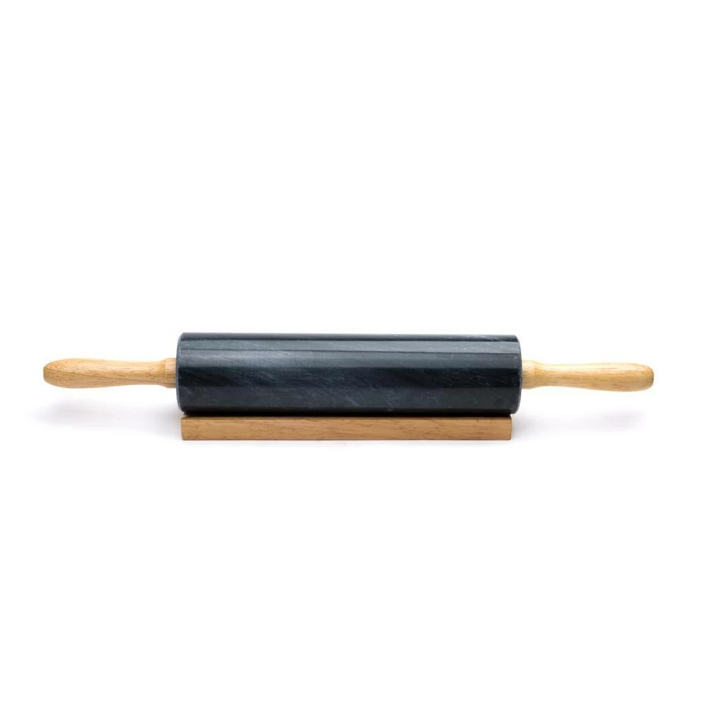 Enjoy baking cookies or rolling out your own pizza dough with the family. Then bring some ease to your baking with this Black Marble Rolling Pin. The rolling pin is 10 in. long, has nylon ball bearings for a smooth rolling, wooden handles for easy grip, and a wooden base for rest. The marble helps keep the dough cool while rolling, and its natural non-stick properties keep dough from clinging. Even the toughest doughs are flattened easily and effortlessly. Let the smoothness and heft of this rolling pin do the hard work for you.