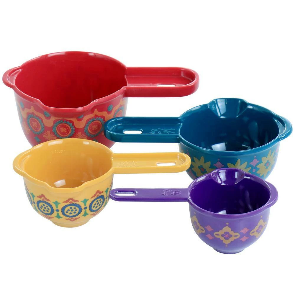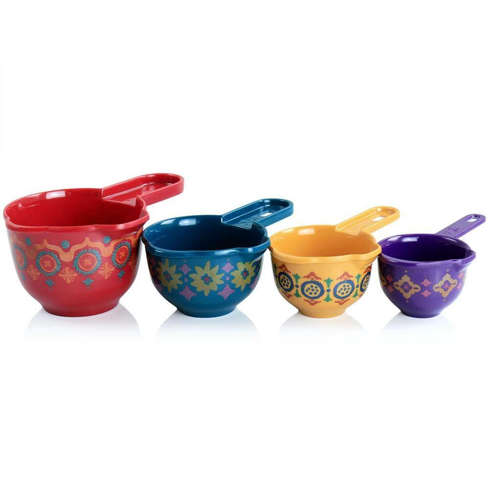 Take your baking essentials to the next level with the Spice by Tia Mowry Cassia Cinnamon 4-piece Melamine Measuring-Cup Set. Decorated with vibrant designs in assorted colors, these measuring-cups offer durability and functionality. Each-cup features measuring marks for accuracy, an ergonomic handle for a comfortable grip, and a side spout for easy transfer of ingredients. Dishwasher safe. Top rack only.