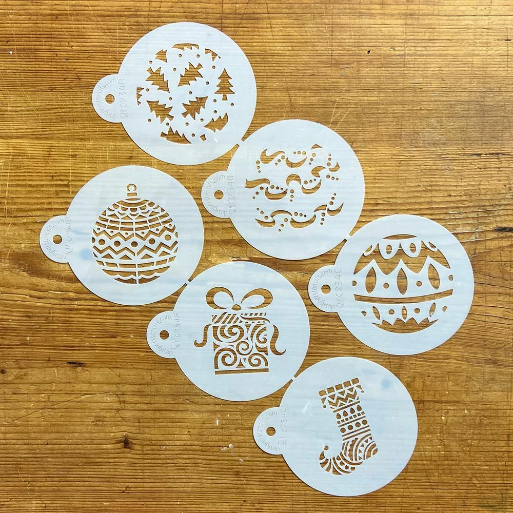 This bundle gives you 6 different festive Christmas patterns for decorating your circle cookies. 1 set of 3 stencils include an Ornament, Gift, and Stocking pattern. The other set of 3 stencils include various ornamental patterns. Cut on durable, 10 mil food grade plastic, each stencil circle is 3.75 in. high to fit a 3 in. to 4 in. circle cookie cutter.