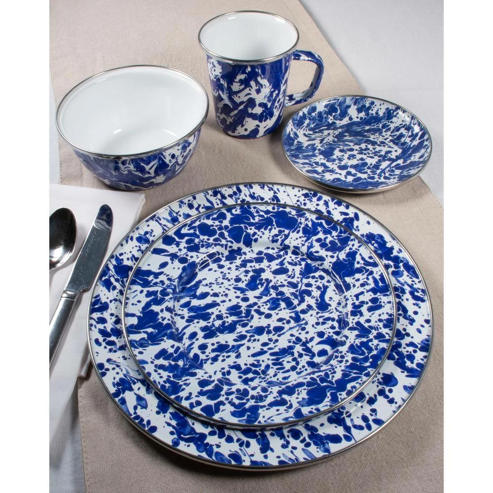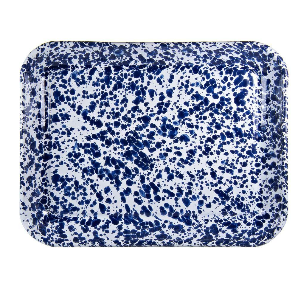 Set of 2 12 in. x 10 in. trays This enamelware is made of carbon steel coated with a porcelain enamel and trimmed in stainless steel. There will be variations in the shading of colors and pattern formations which are the results of the hand-dipped process. The swirl design is a classic, retro staple for enamelware cookware and serveware. The contrast of colors creates a distinct look and brings a casual artistic flair to your table setting. Each piece is individually hand crafted and is as unique as you are. Skilled artisans hand dip the white background color, then use a brush to hand apply the secondary color swirls. This creates a unique piece and design each time. The elegant and inviting aesthetic draws the eyes into the many spattered patterns flowing throughout. Your piece will be one-of-a-kind and exclusive to you as you create your own distinctive style.