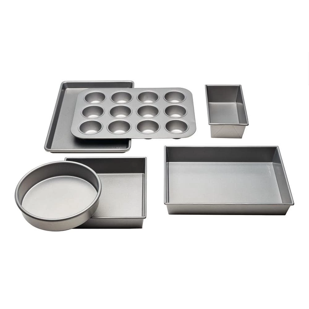 - Set includes: 1- 1lb loaf pan, 1- 14.75 x 9.75 x 1 in. baking sheet, 1- 12 cup muffin pan, 1- 8 in. round pan, 1- 9 in. square pan, and 1- 9 x 13 in. cake pan