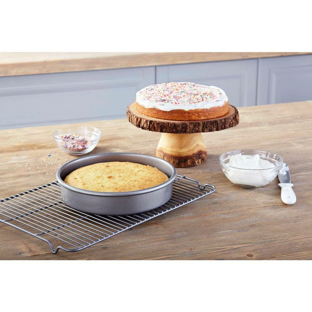This Chicago Metallic Commercial II 9 in. Round Cake Pan is made of strong, durable, heavy-weight aluminized steel providing superior heat conduction and even baking. The diamond-quality, non-stick dual coating provides ease in baking and cleaning. Dishwasher, freezer and oven safe. Cake pan measures 9 in. Dia x 2 in. high.