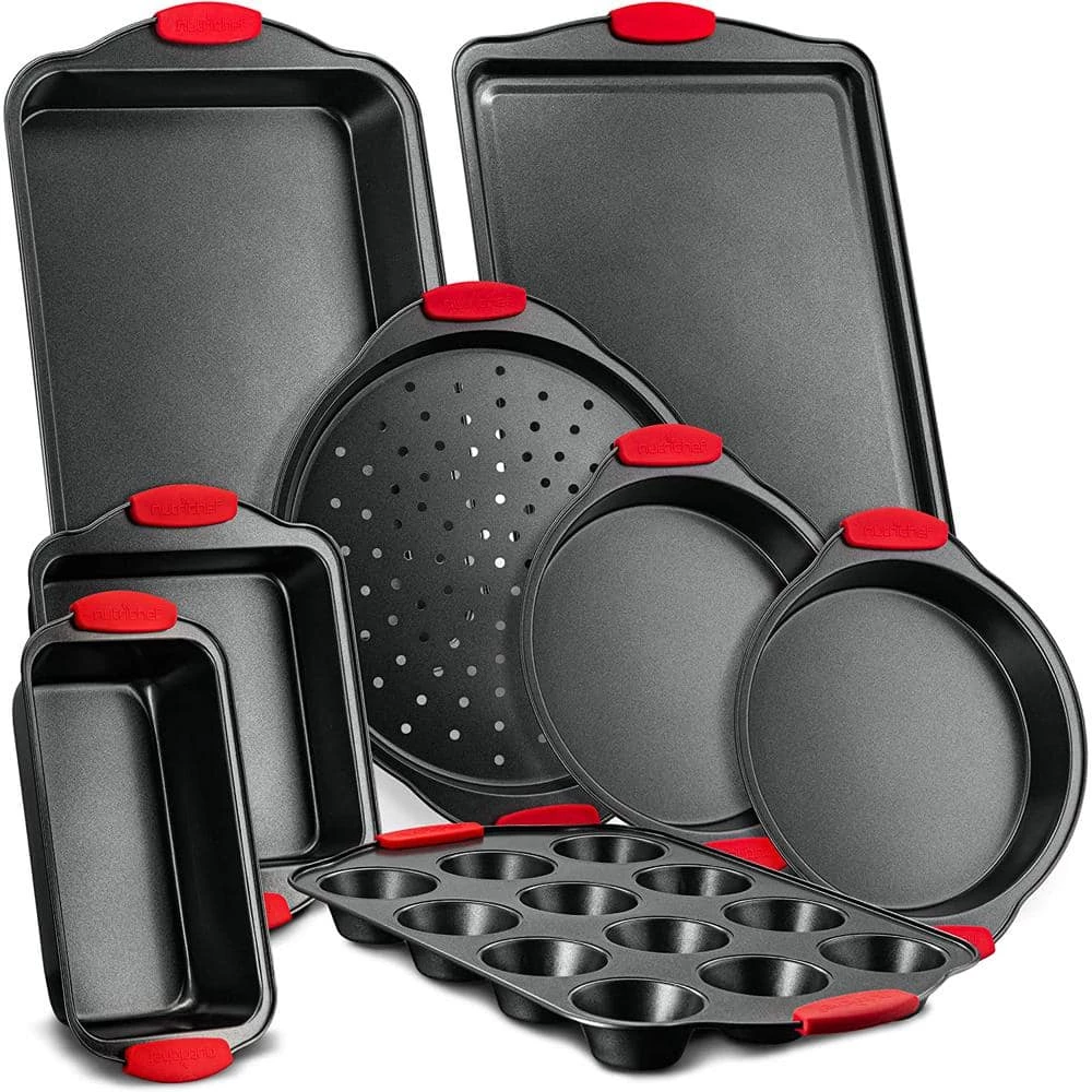 - Flexible and nonstick carbon steel bakeware set with red silicone handles