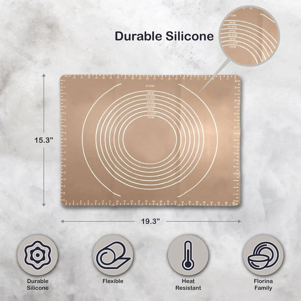 Silicone baking mat for rolling out pastry dough, pie crusts, homemade pasta, and cookies. Convenient measuring guides help you size your pie crusts like a professional baker. Our silicone is heatproof up to 600° F, so you can enjoy the convenience of dishwasher washing.