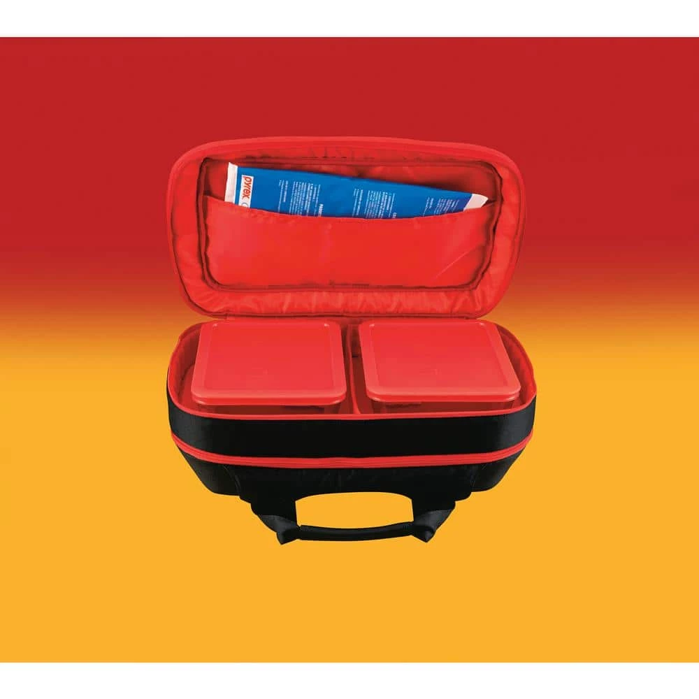 Transport food safely and easily with this set that pairs our large Pyrex baking dish and two lidded storage containers with a designed-to-fit insulated bag. The partitioned design keeps hot food separate from cold, and two hot/cold packs ensure they stay at the perfect temperature en route. The bag features an easy to use zipper and comfortable handle for a sure grip.