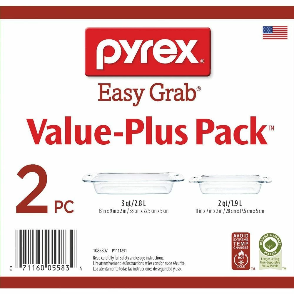 - Easy grab 2-piece oblong baking dish set includes: 2 Qt. and 3 Qt. (7 x 11 and 9 x 13) oblong glass baking dishes