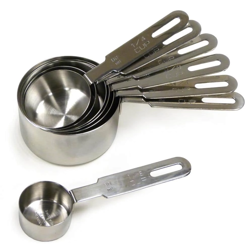 These heavy gauge stainless steel measuring cups have long rounded handles which make them durable and easy to use. This 7-piece set includes 1, 3/4, 2/3, 1/2, 1/3, 1/4 and 1/8 cup. This will be the last measuring cup set you will ever need.