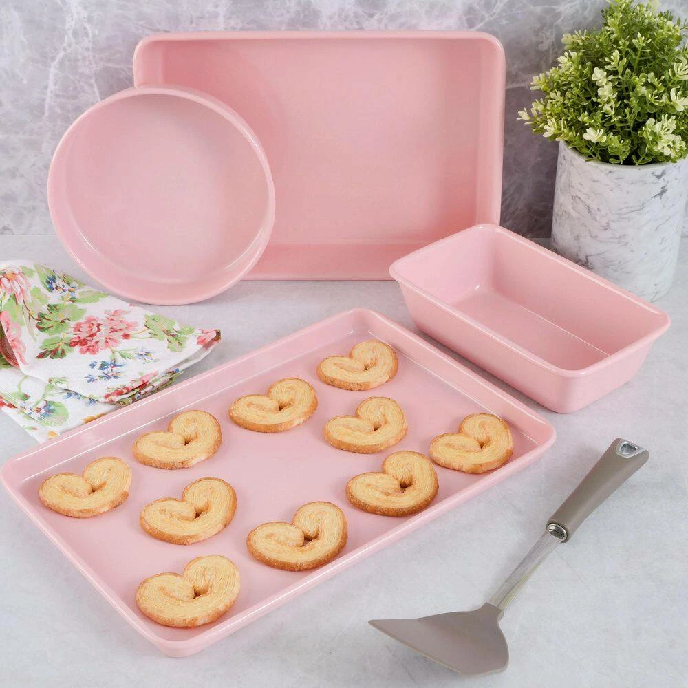 The MARTHA STEWART Everyday colored bakeware set will add a fun pop of color to your kitchen and make your favorite bakes a little more bright. This set comes with all your basic baking essentials, including 1 cookie sheet, 1 rectangular baking pan, 1 round cake pan, and 1 loaf pan. Whether you are gifting this set to a colorful person or treating yourself to some new bakeware, it will not disappoint. Constructed with durable carbon steel that promotes even heat distribution for consistent results and features a nonstick interior for easy food release and quick clean up. Set all your bakes up for success with this set by MARTHA STEWART.